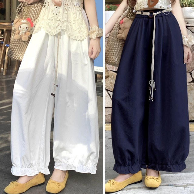 レディース 無地 パンツ ワイドレッグ カジュアルパンツ 裾フリル ホワイト ネイビー AS12279
