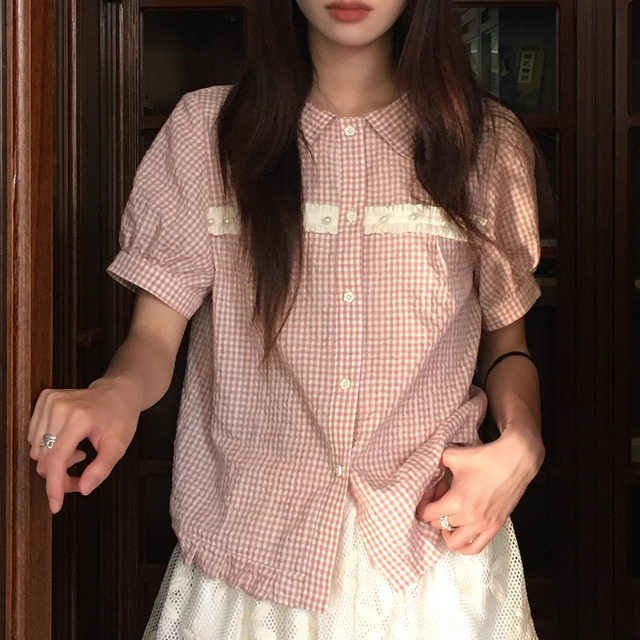 レディース チェック柄 丸襟 トップス ブラウス 半袖 ピンク AS12464