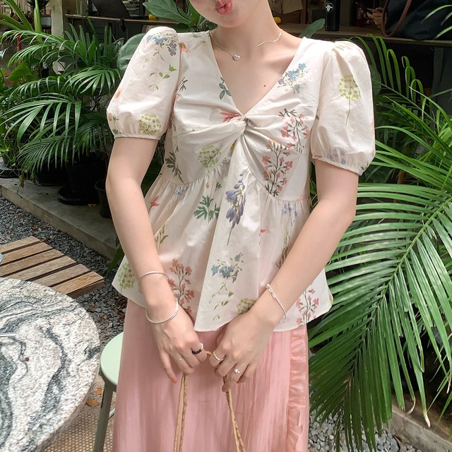 レディース 花柄 半袖 トップス ブラウス パフスリーブ AS12349