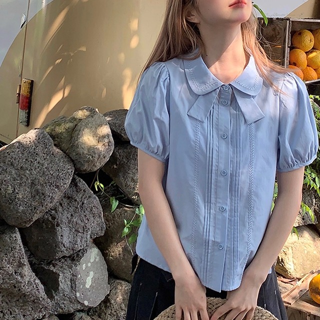 レディース 半袖 トップス ブラウス 刺繍 蝶ネクタイデザイン ブルー AS12447