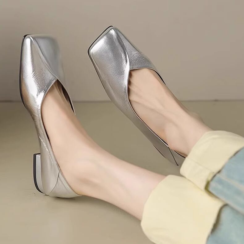 レディース シューズ レザー スクエアトゥ パンプス ローヒール シルバー AS11833
