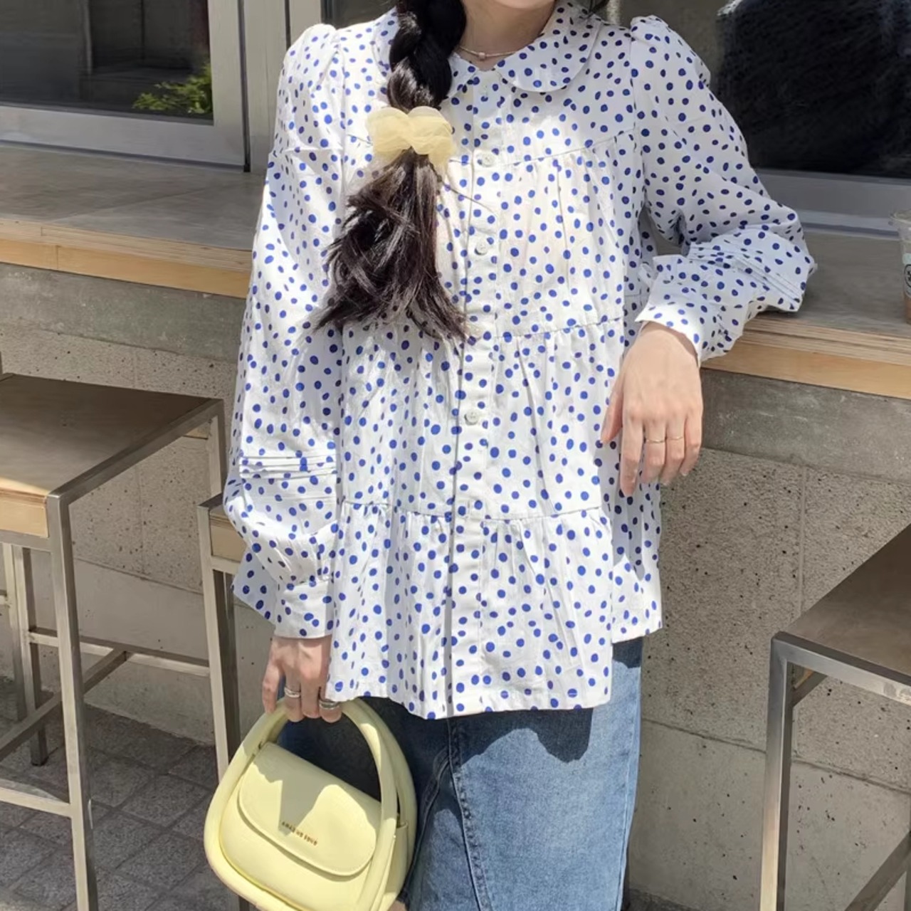 レディース レトロ ドット柄 水玉柄 ブラウス 長袖 ブルー AS11873