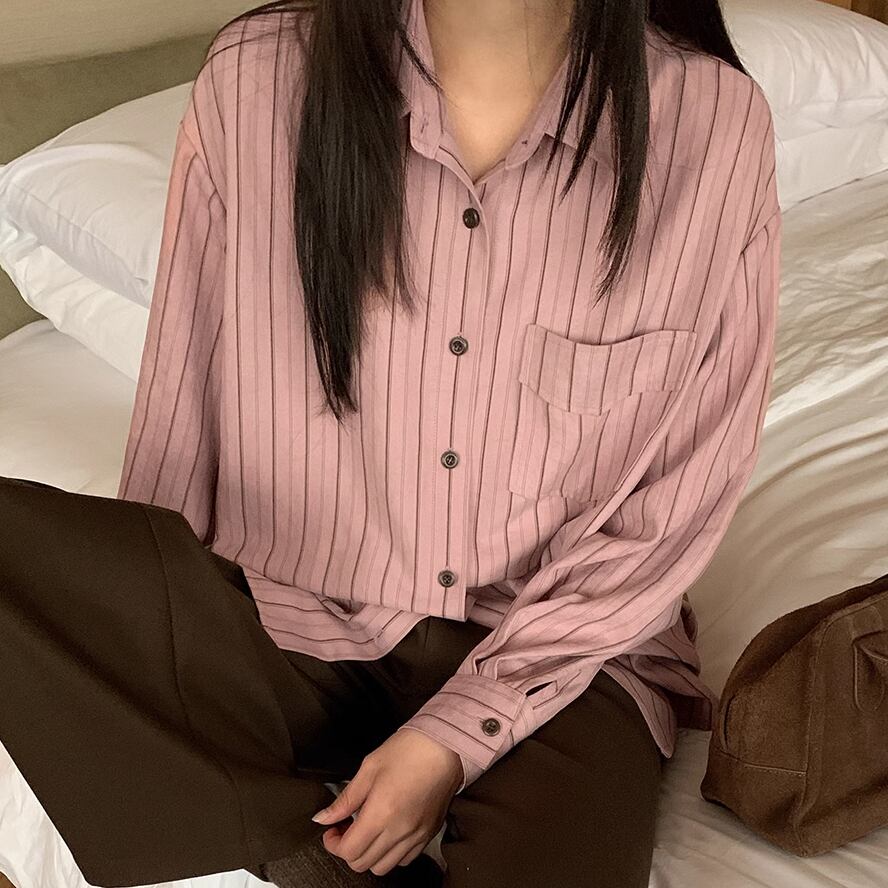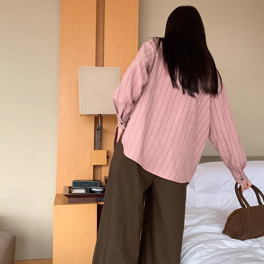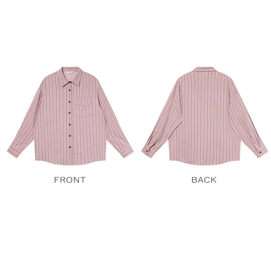 レディース ストライプ柄 シャツ 長袖 アプリコット ピンク AS11875