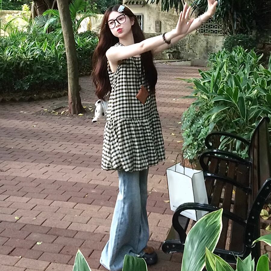 チェック柄のノースリーブワンピース。