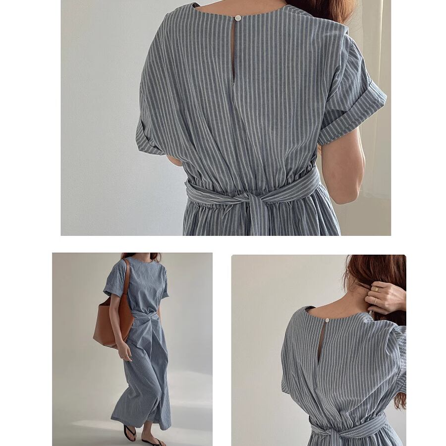 レディース ストライプ柄 半袖 ロングワンピース バックスリット ブルー AS11922