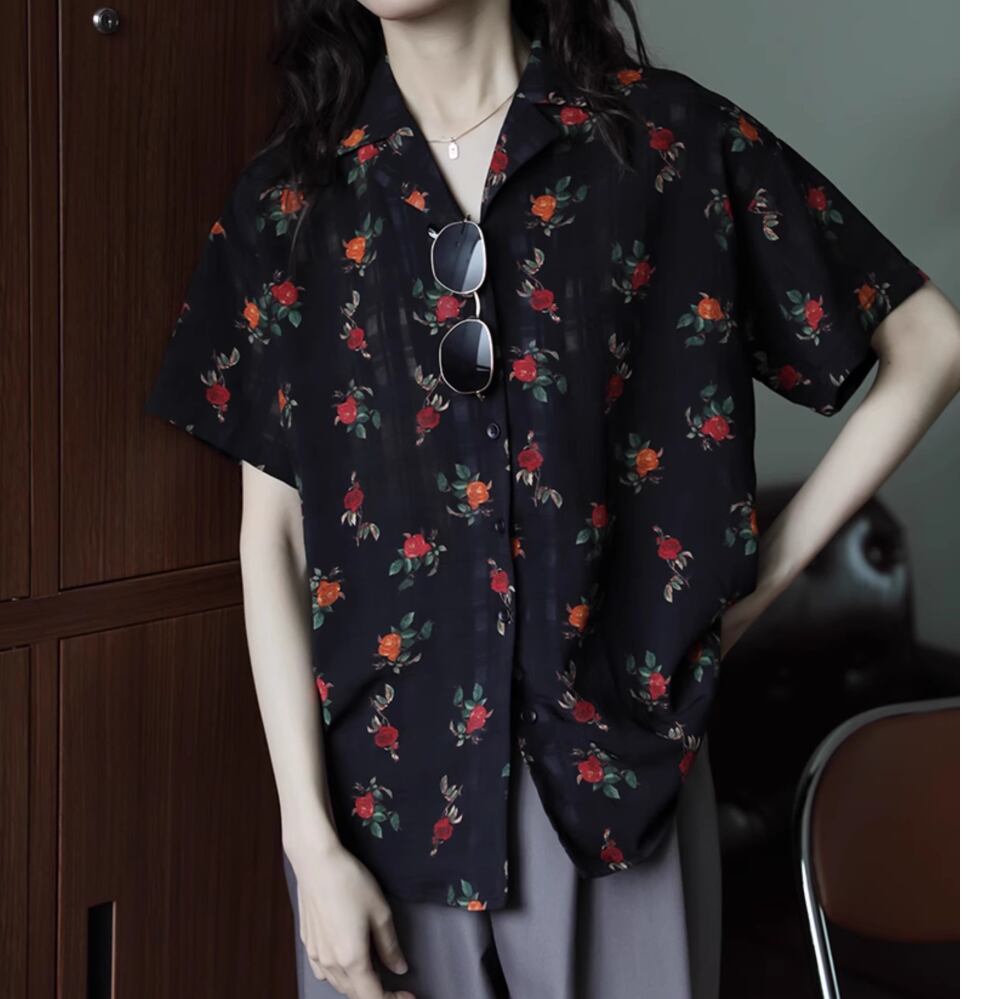 レディース 半袖 シャツ 花柄 ローズ柄 ブラック アプリコット AS11959