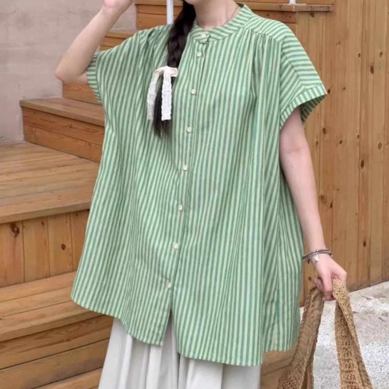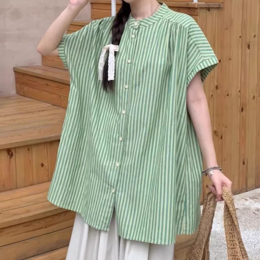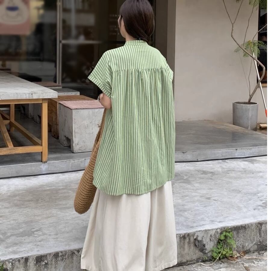 レディース 半袖 ストライプ柄 トップス シャツ ロング丈 オーバーシルエットAS11970