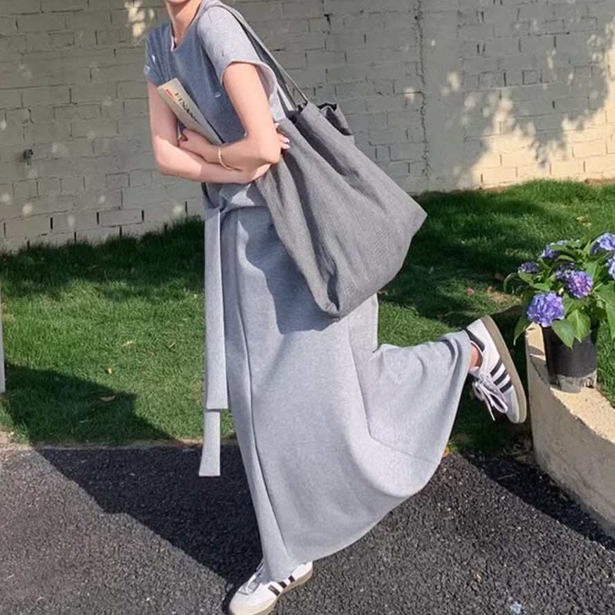 レディース 無地 カジュアル 半袖 ロングワンピース グレー AS12047