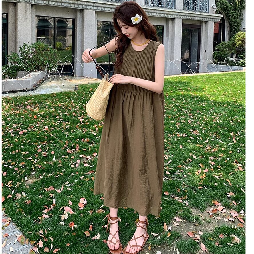 レディース 背中空き 無地 ロングワンピース ノースリーブ ブラウン AS12052