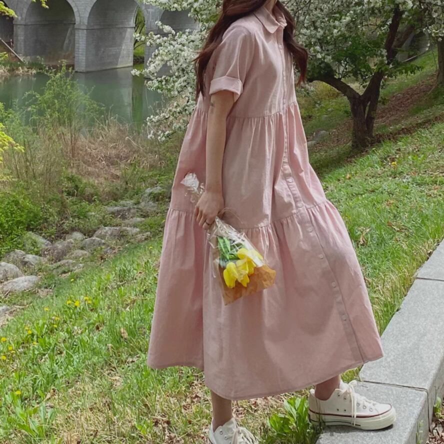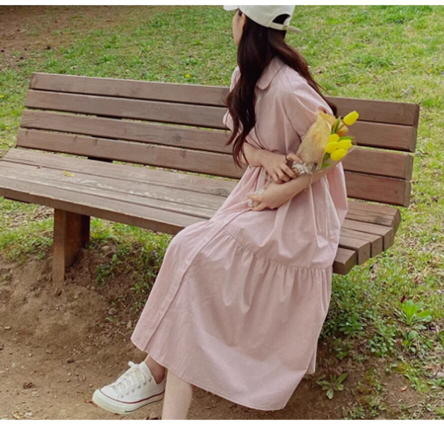 レディース 無地 ロングワンピース 半袖 ピンク AS12053