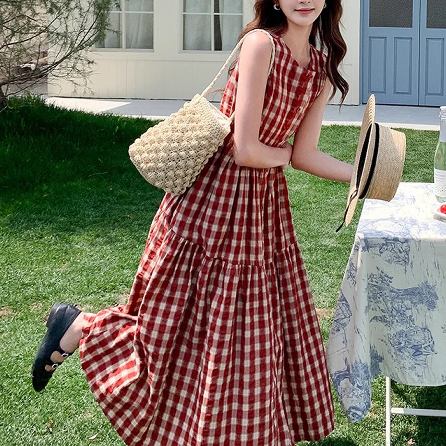 レディース チェック柄 ノースリーブ ロングワンピース レッド AS12057