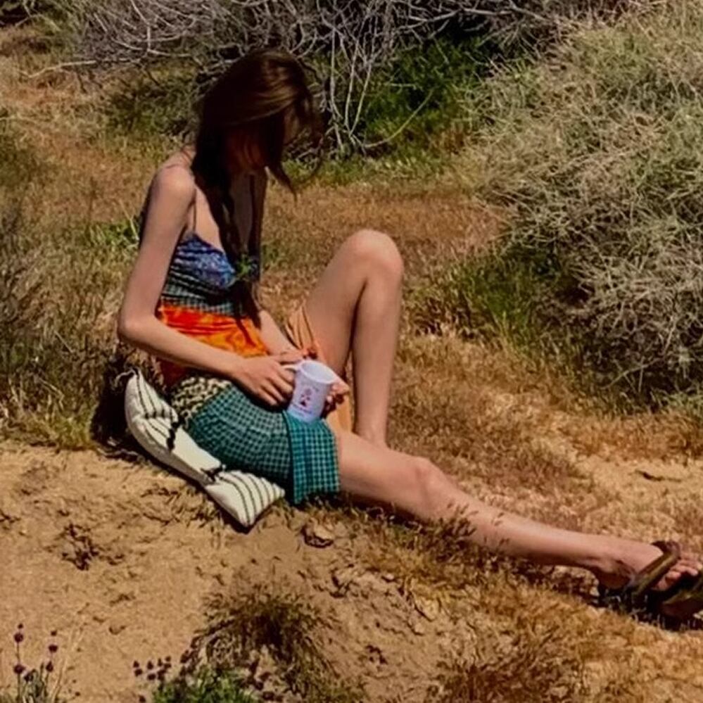 花柄とチェック柄の華やかなワンピース。