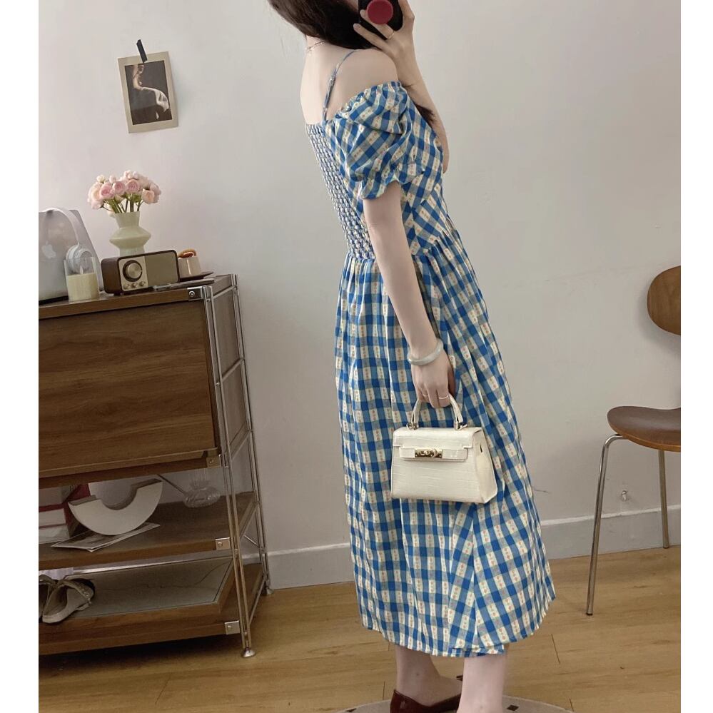 レディース チェック柄 ワンピース ロング丈 半袖 大きいサイズ ブルー AS12094