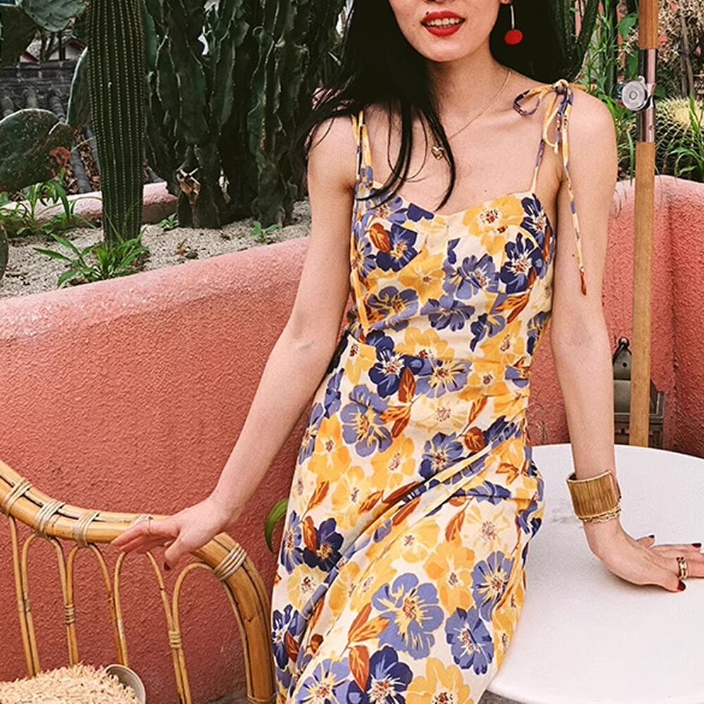 レディース 花柄 キャミソールワンピース ロング丈 サイドスリット イエロー AS12209