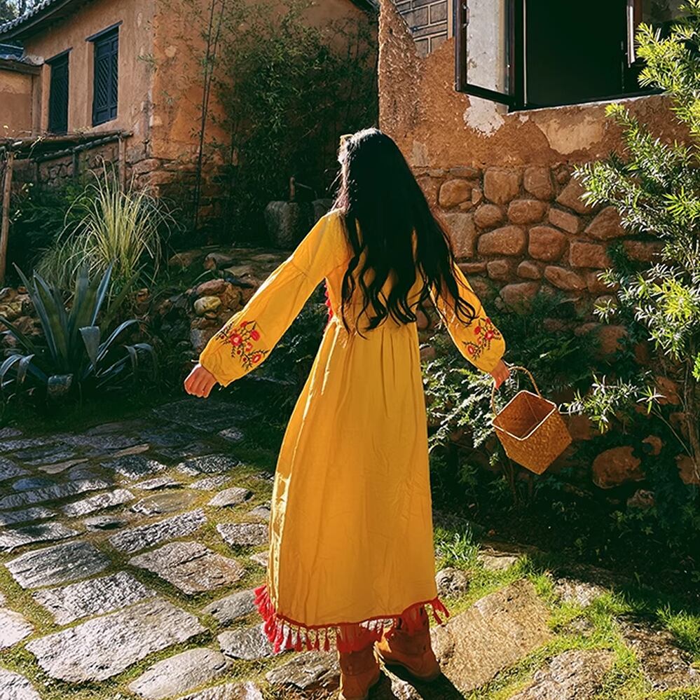 レディース エスニック風デザイン 長袖 刺繍 ロングワンピース イエロー AS12210