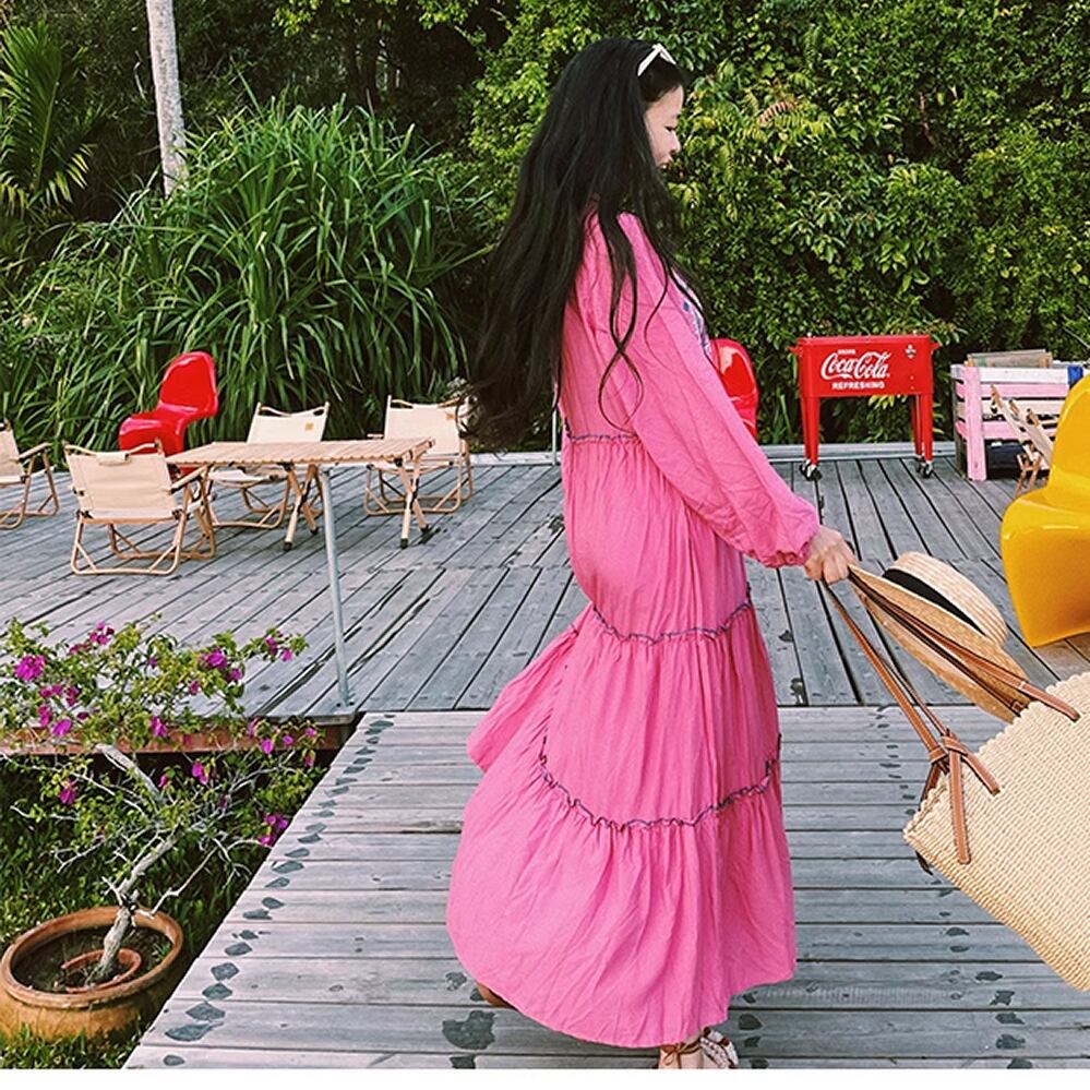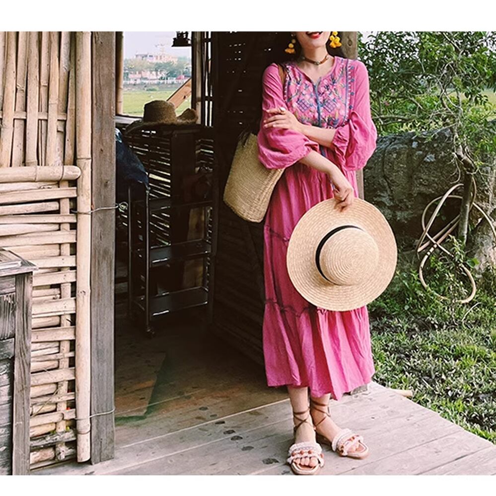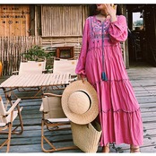 レディース エスニック風デザイン ロングワンピース レトロ 刺繍 ピンク AS12212