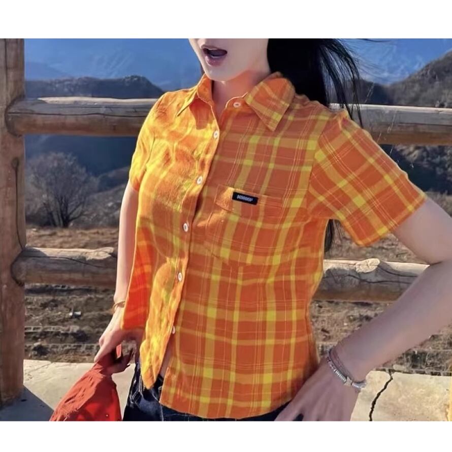 レディース チェック柄 半袖 シャツ トップス オレンジ AS12222