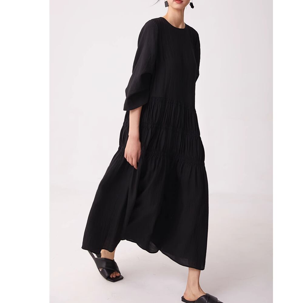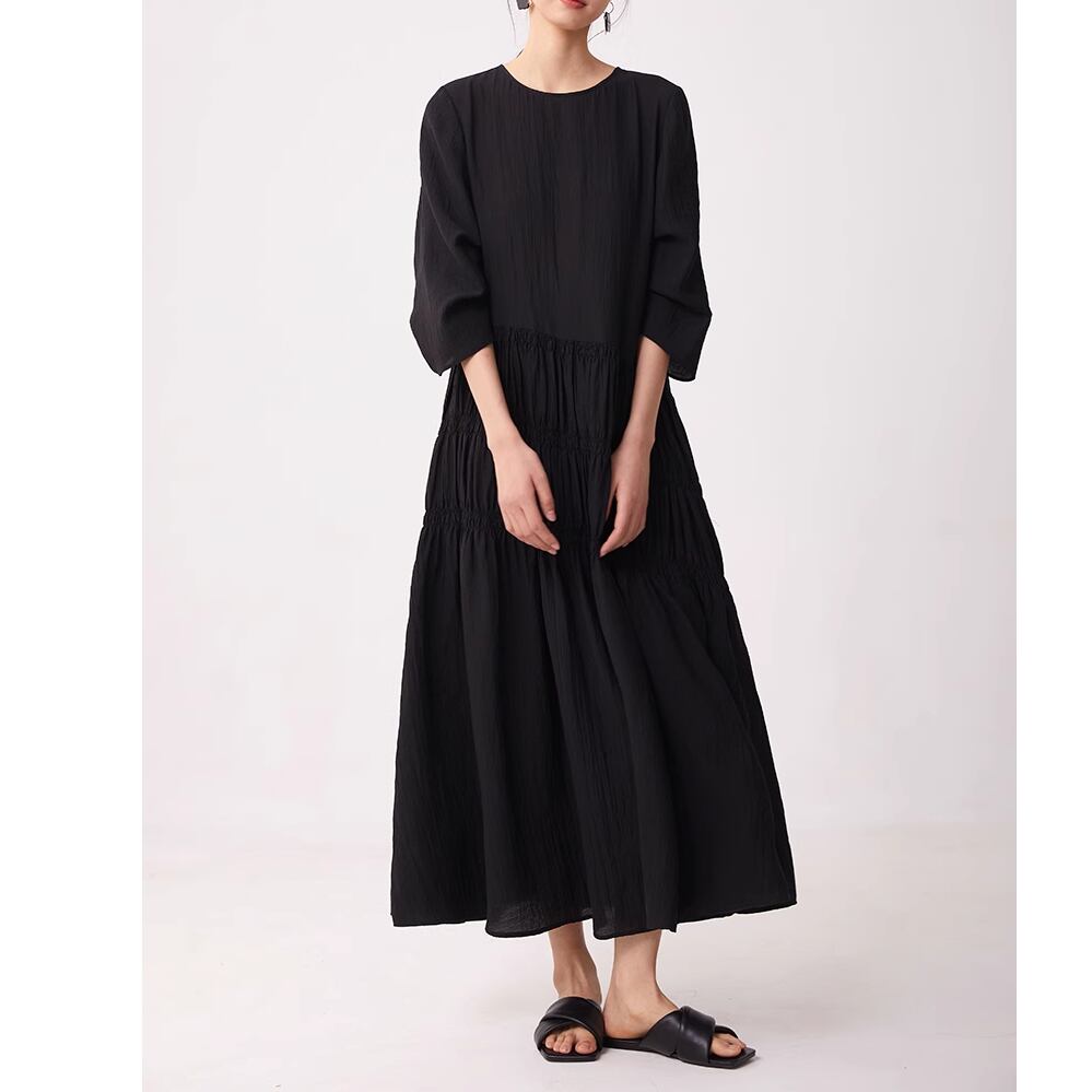 レディース 無地 7分袖 シャーリング ロングワンピース ブラック AS12234