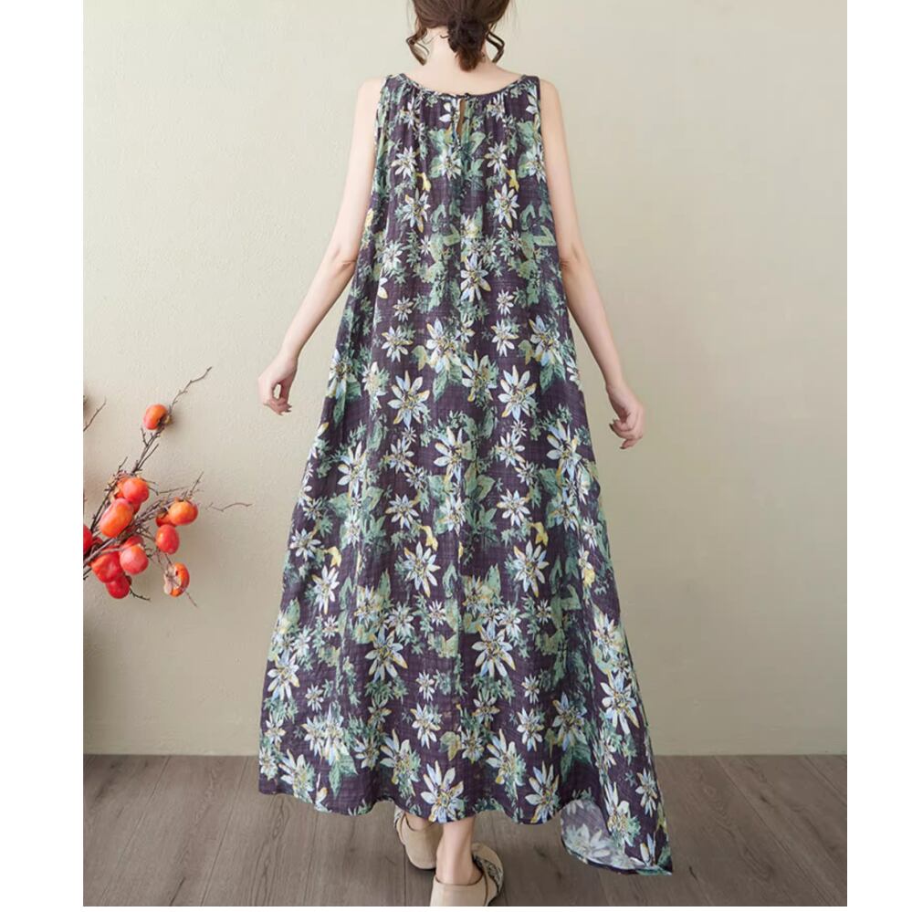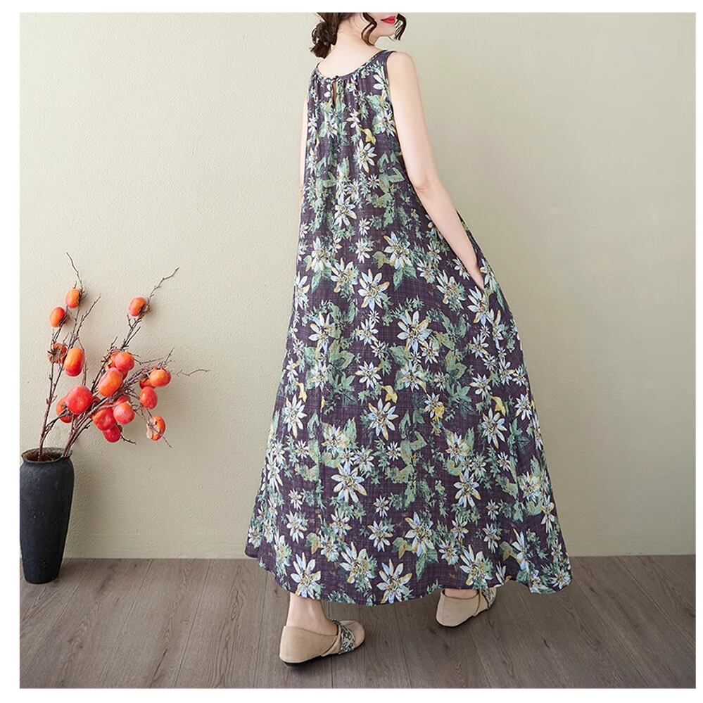 レディース 花柄 レトロ ノースリーブ ワンピース ロング丈 AS12243