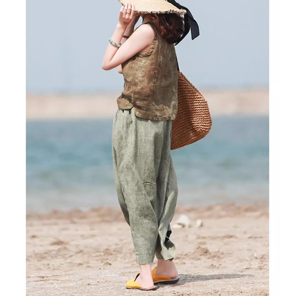 レディース ワイドレッグ カジュアルパンツ 薄手 リネン混 クロップド丈 グリーン AS12245