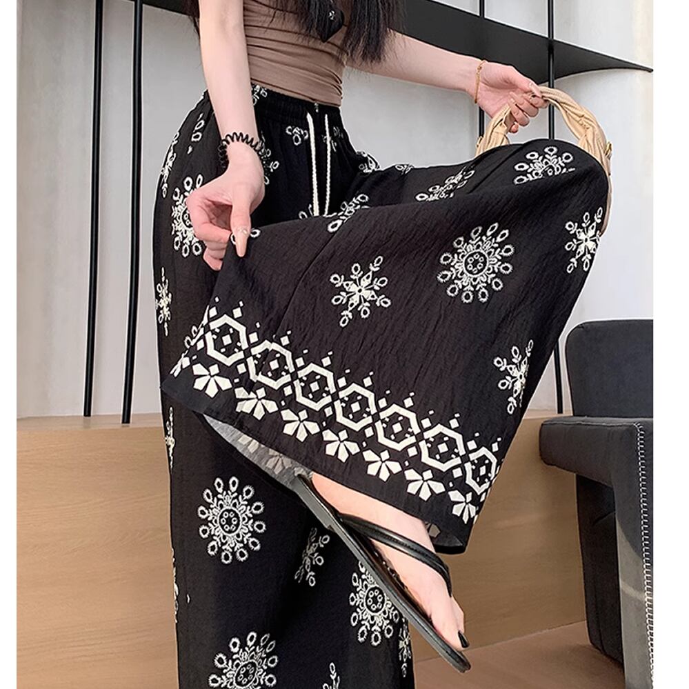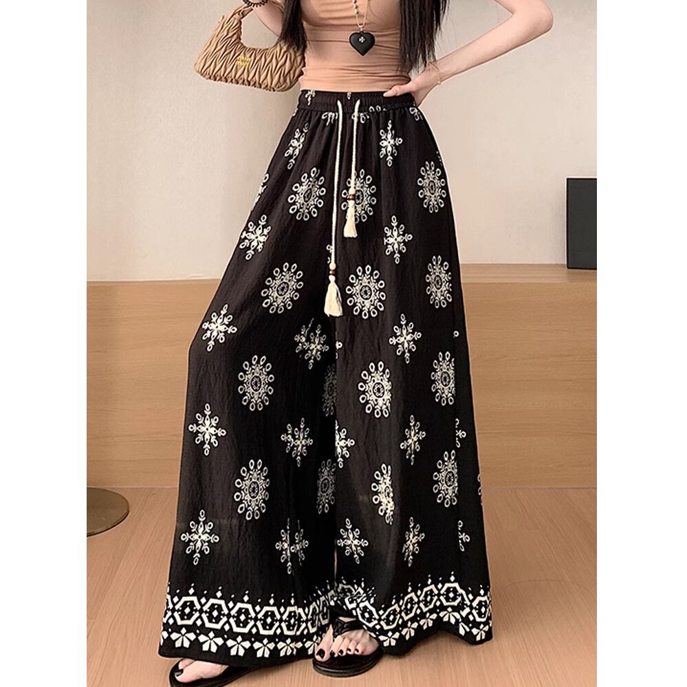 レディース 花柄 ワイドレッグ カジュアルパンツ ブラック アプリコット AS12247