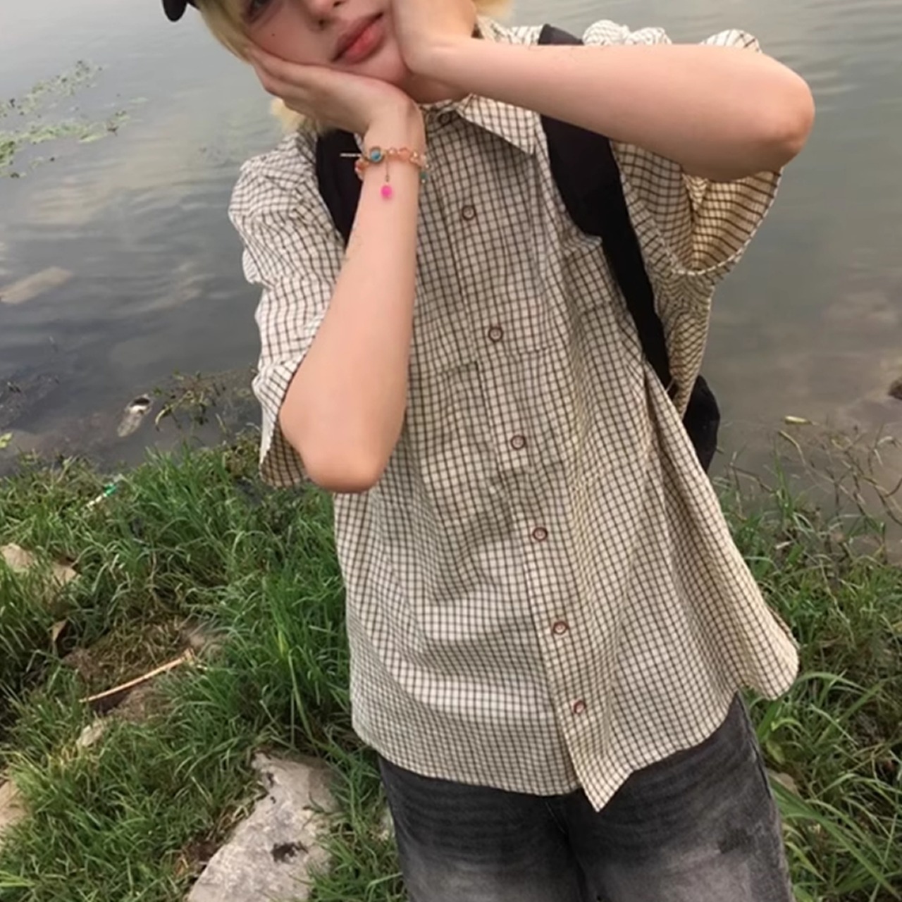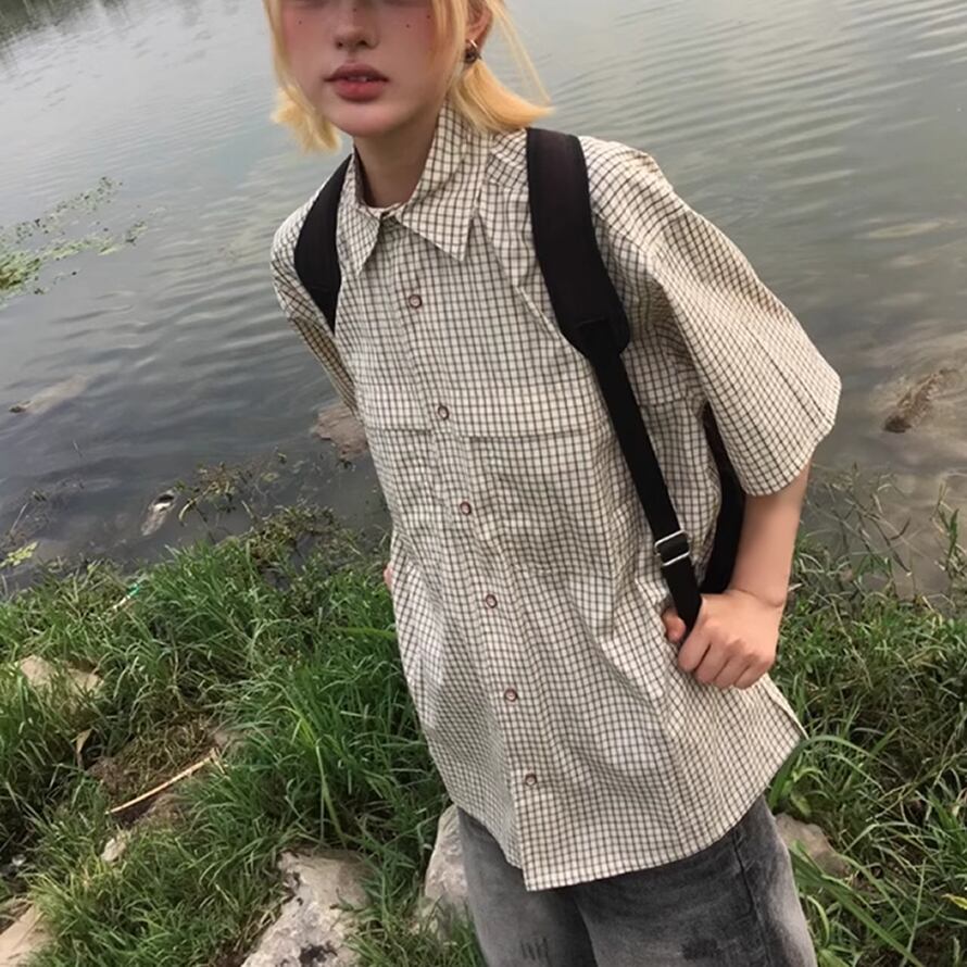 レディース チェック柄 半袖 トップス シャツ カーキ 薄手 レトロ AS12251