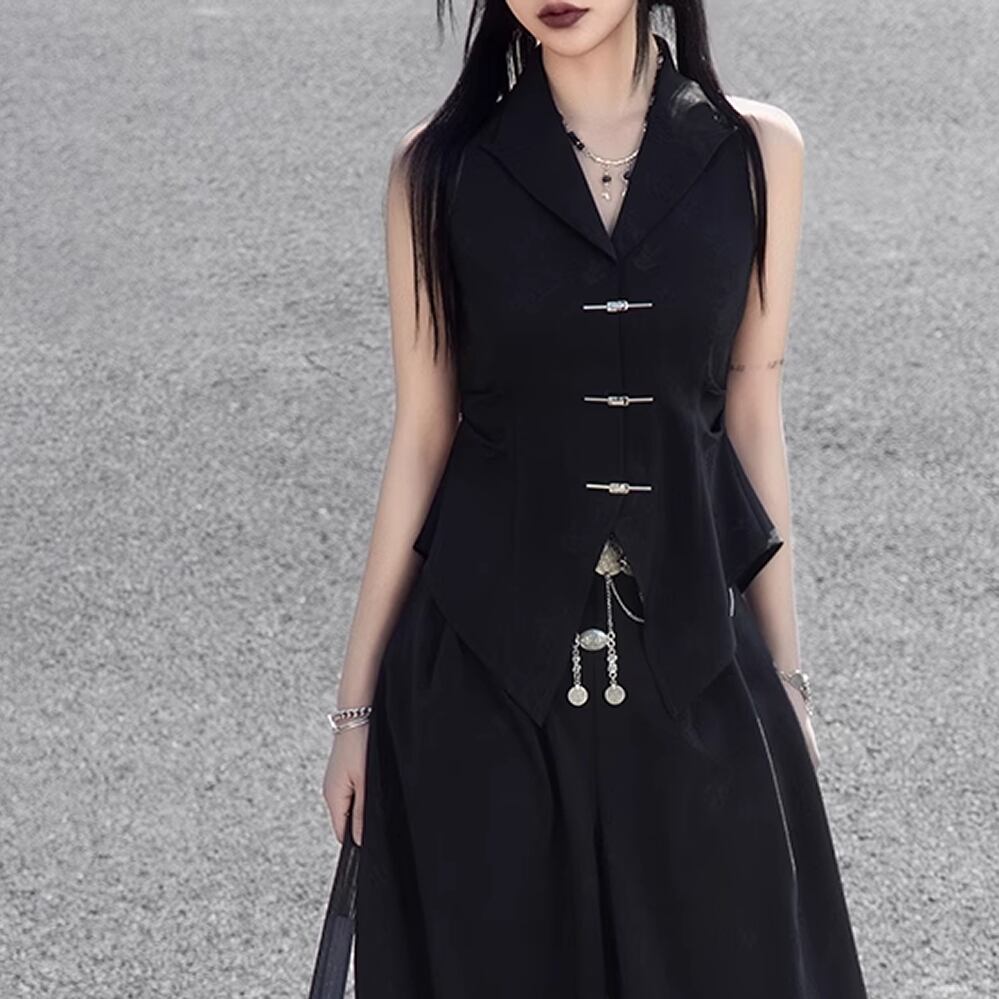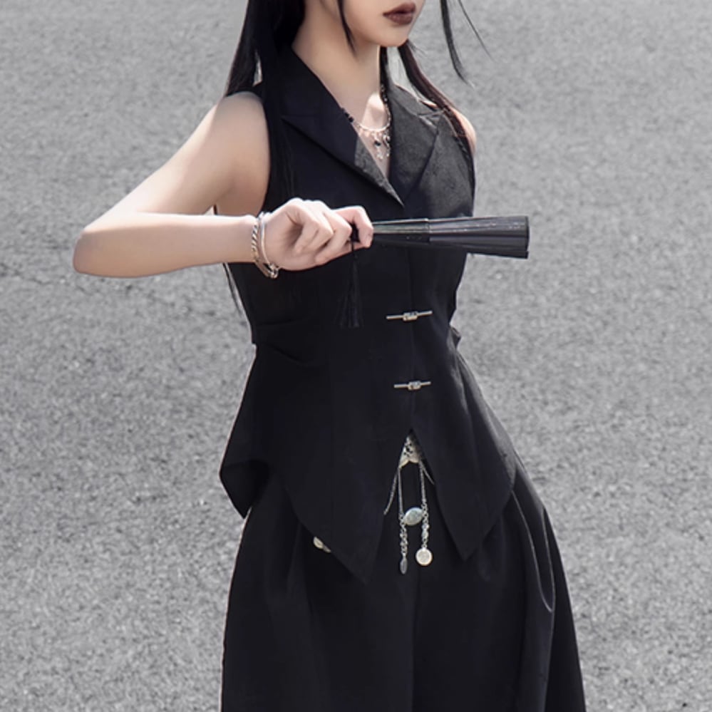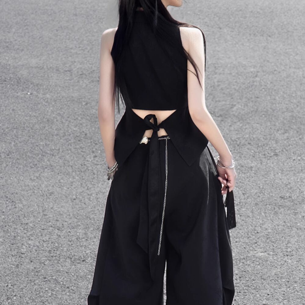 レディース 中国風デザイン ベスト オープンバック 背中空き トップス ブラック AS12290