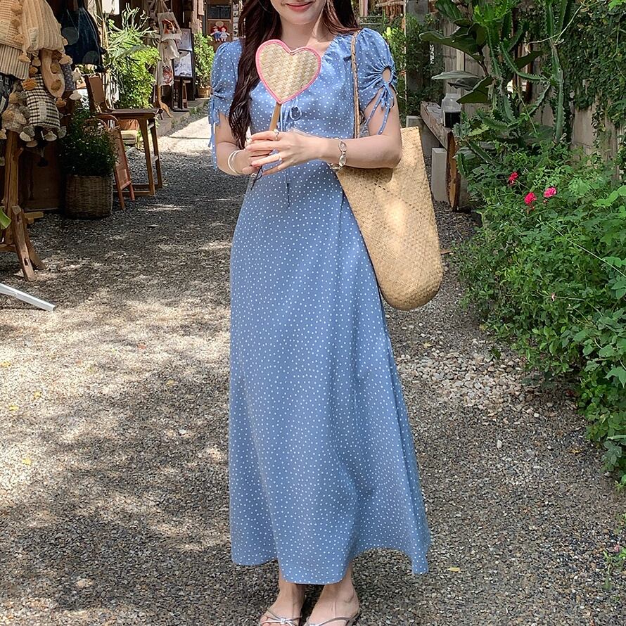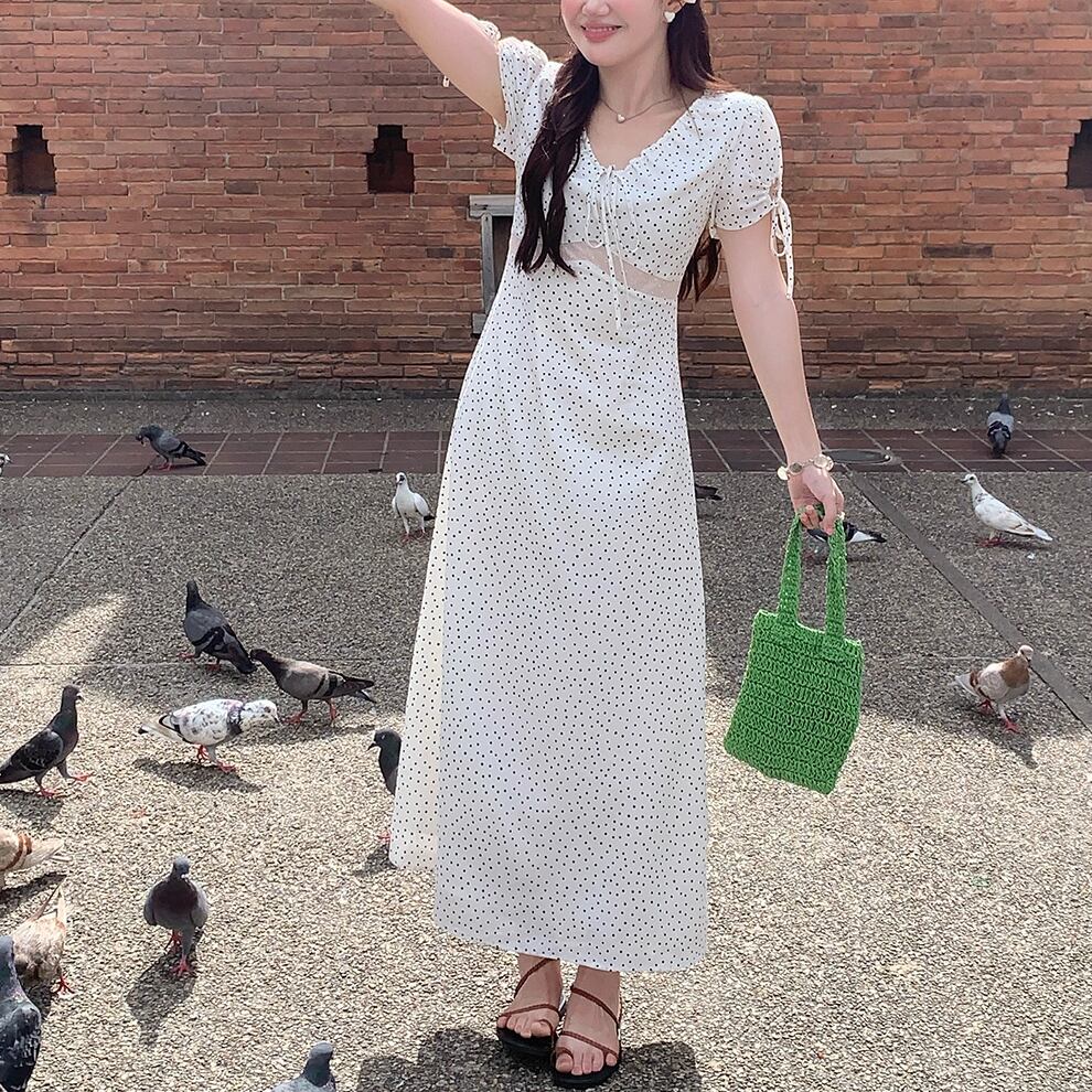 レディース 半袖 ドット柄 ロングワンピース ホワイト ブルー AS12331
