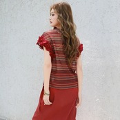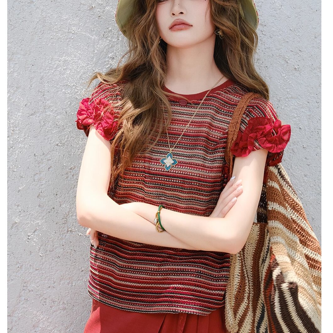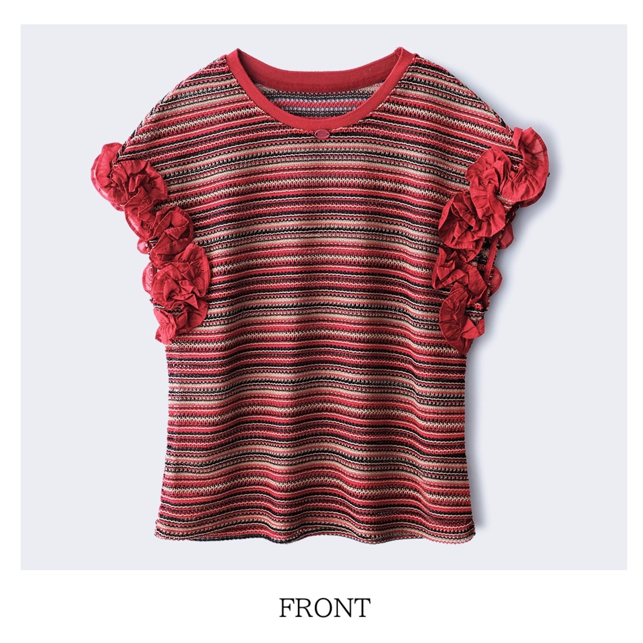 レディース ボーダー柄 フリル 半袖 トップス レッド AS12342