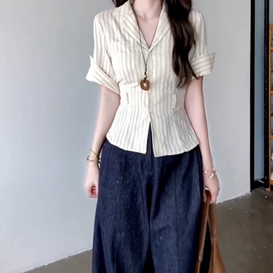ストライプ柄の半袖シャツ。