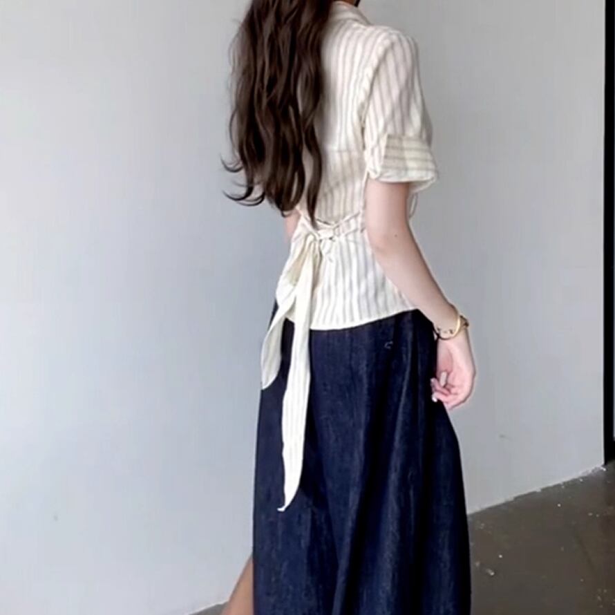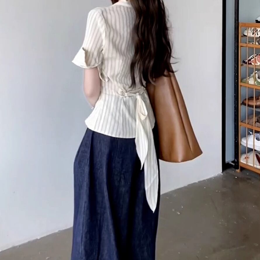 レディース 半袖 ストライプ柄 トップス シャツ Vネック バックリボン ライトイエロー AS12344