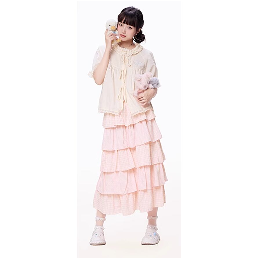 レディース チェック柄 フリル ロングスカート ケーキスカート ピンク AS12346