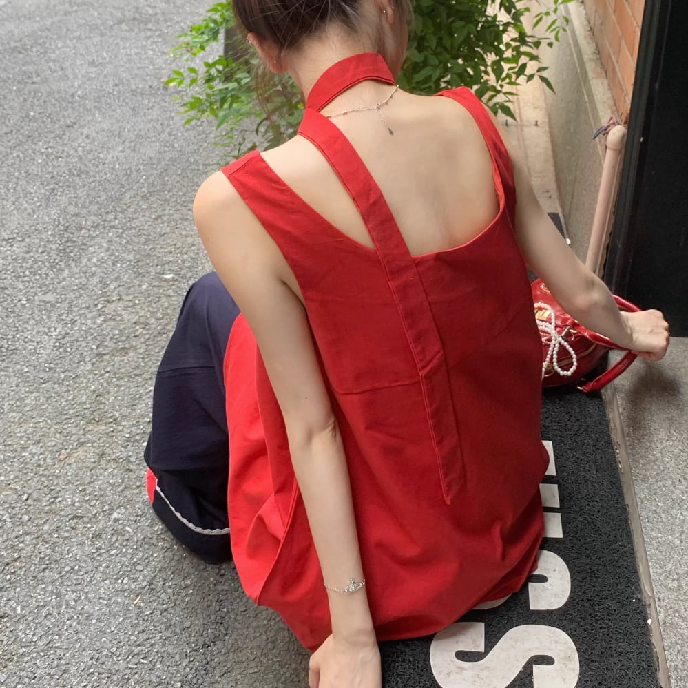 レディース ノースリーブ ロング丈 トップス リボン付き 赤 レッド AS12384