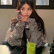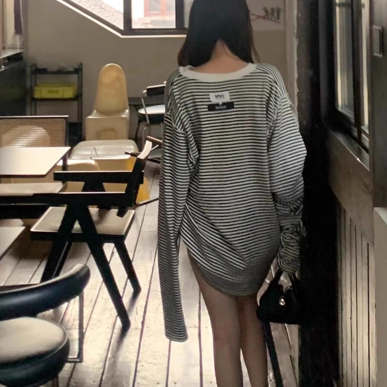 ボーダー柄のロング丈トップス。