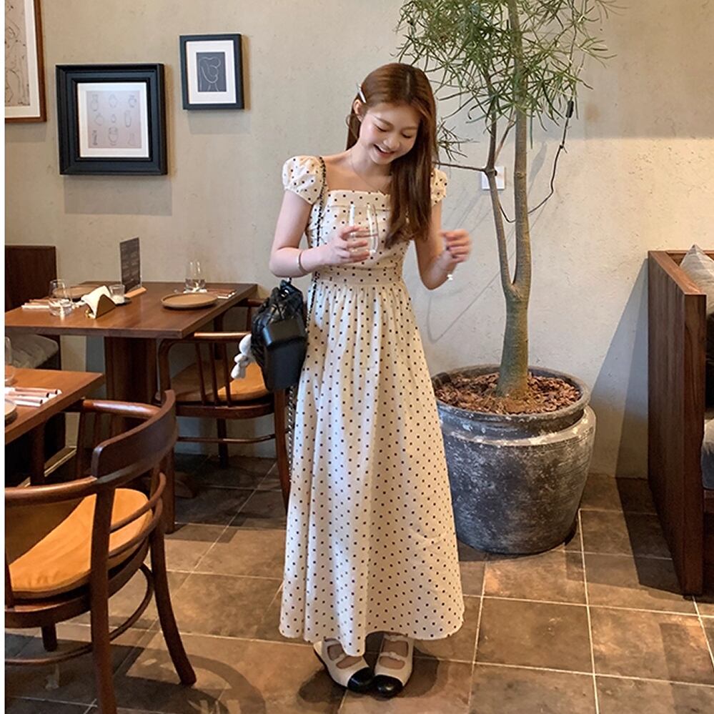 レディース 半袖 ドット柄 ロングワンピース アプリコット AS12428