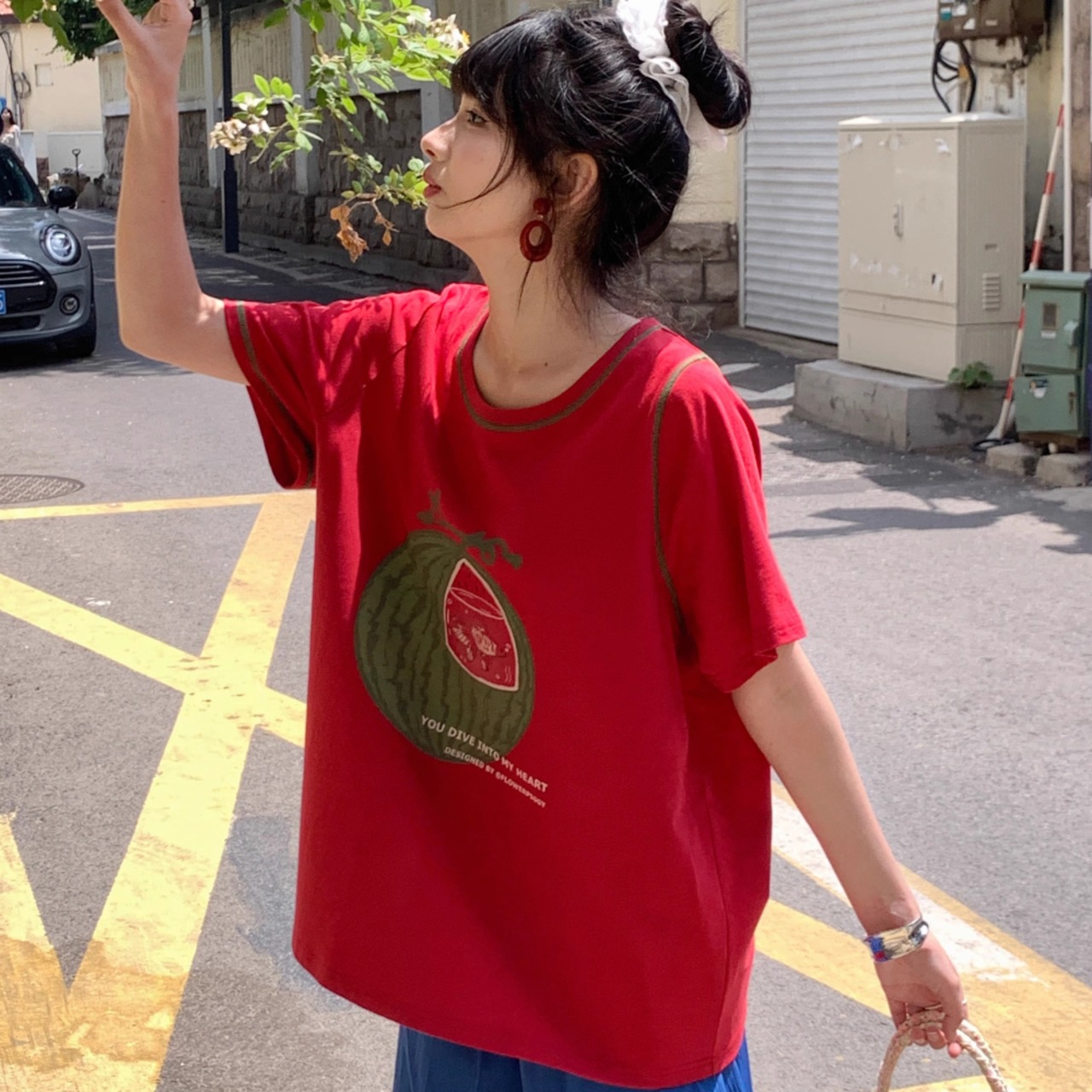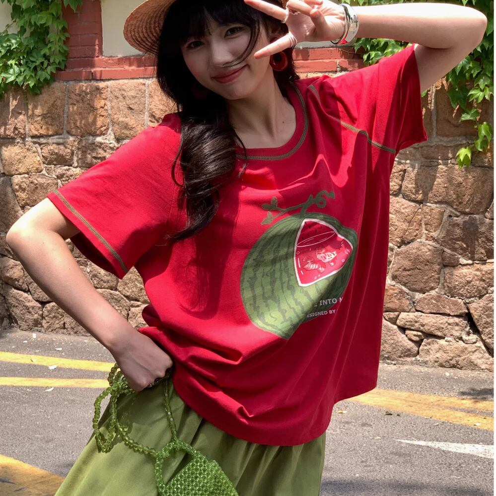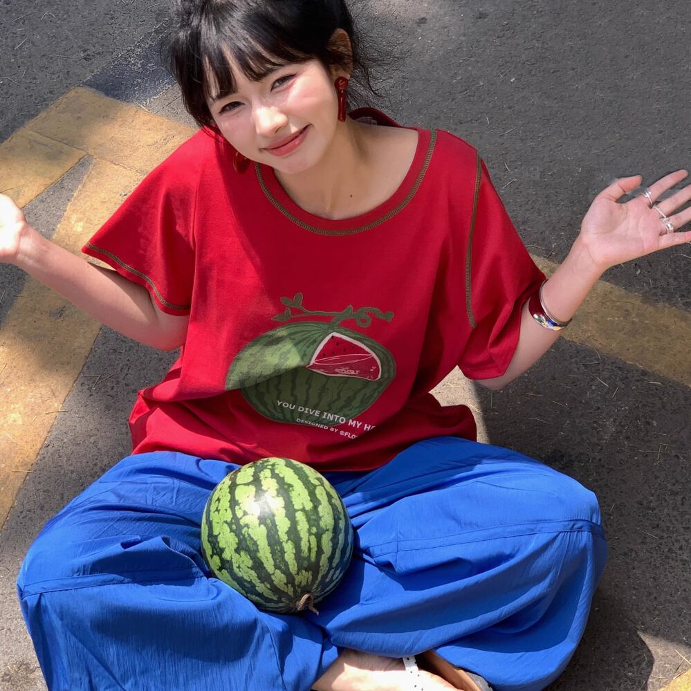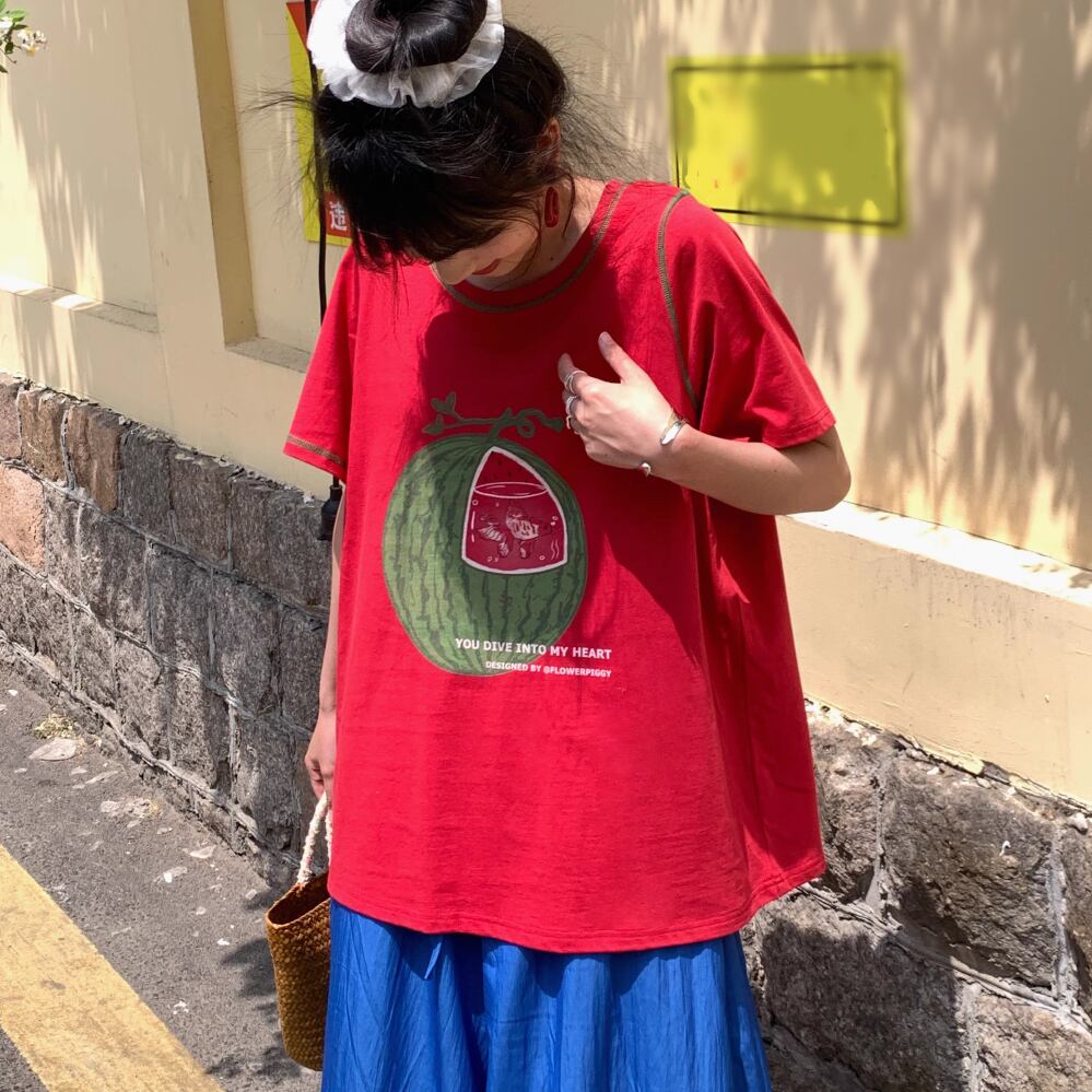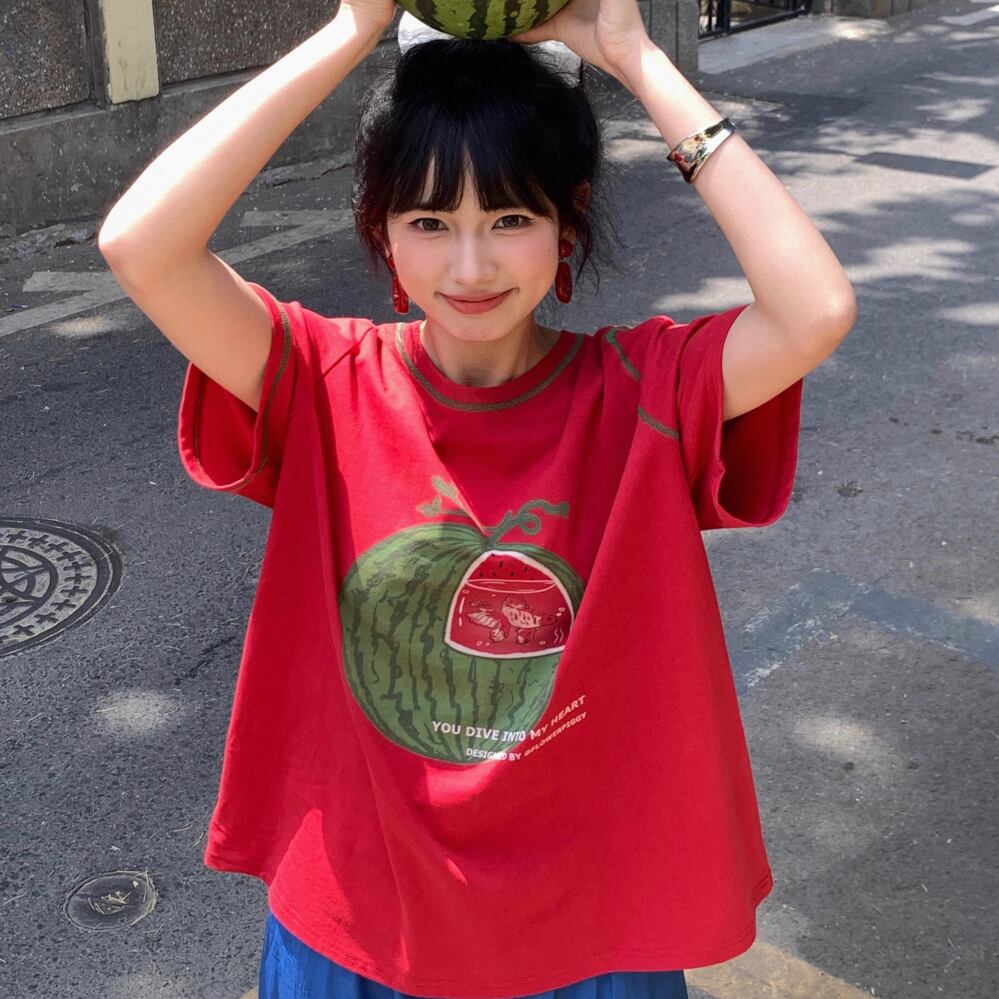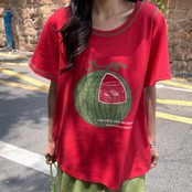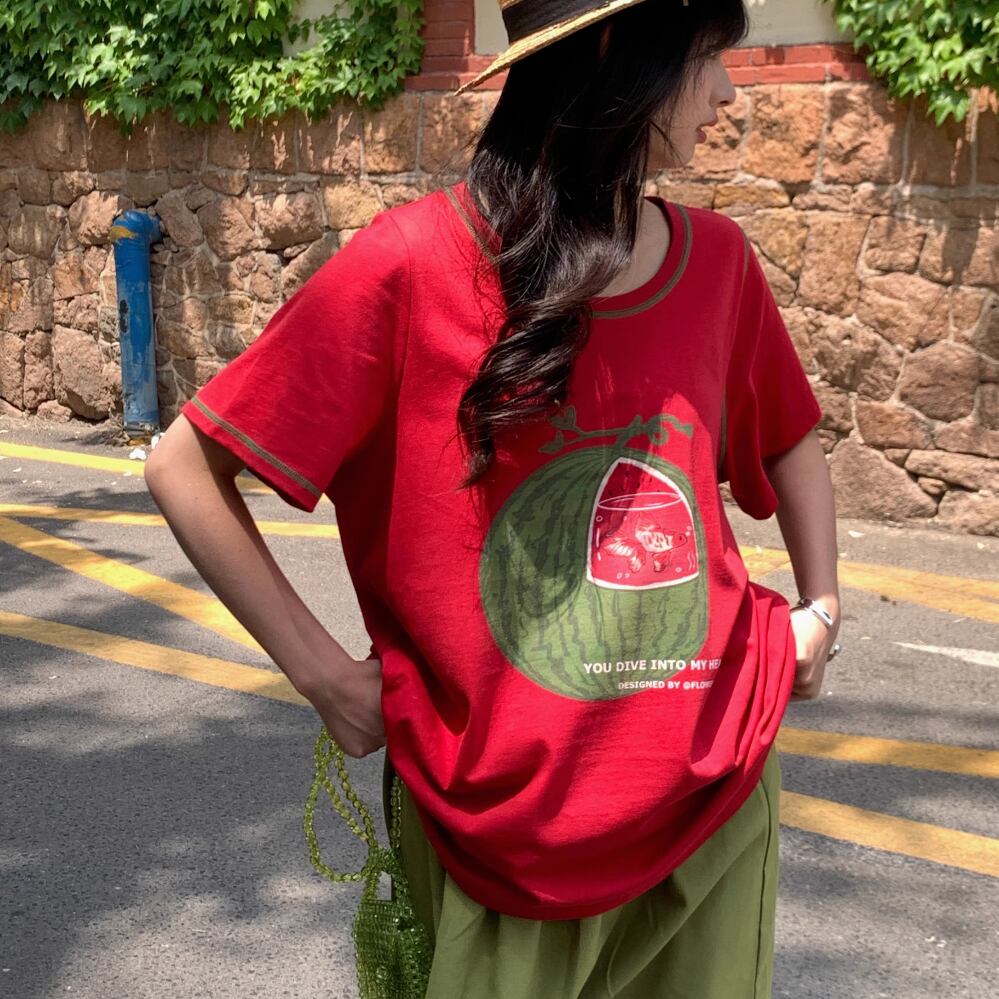 レディース スイカ水槽 金魚 プリント Tシャツ トップス 半袖 レッド AS12456