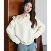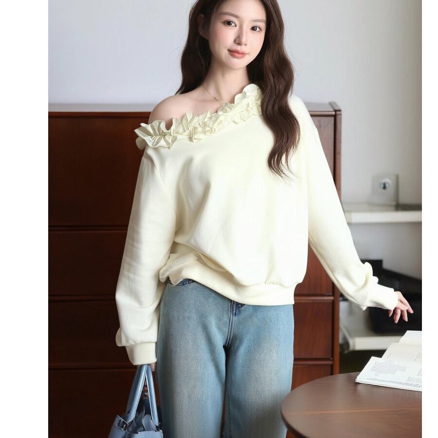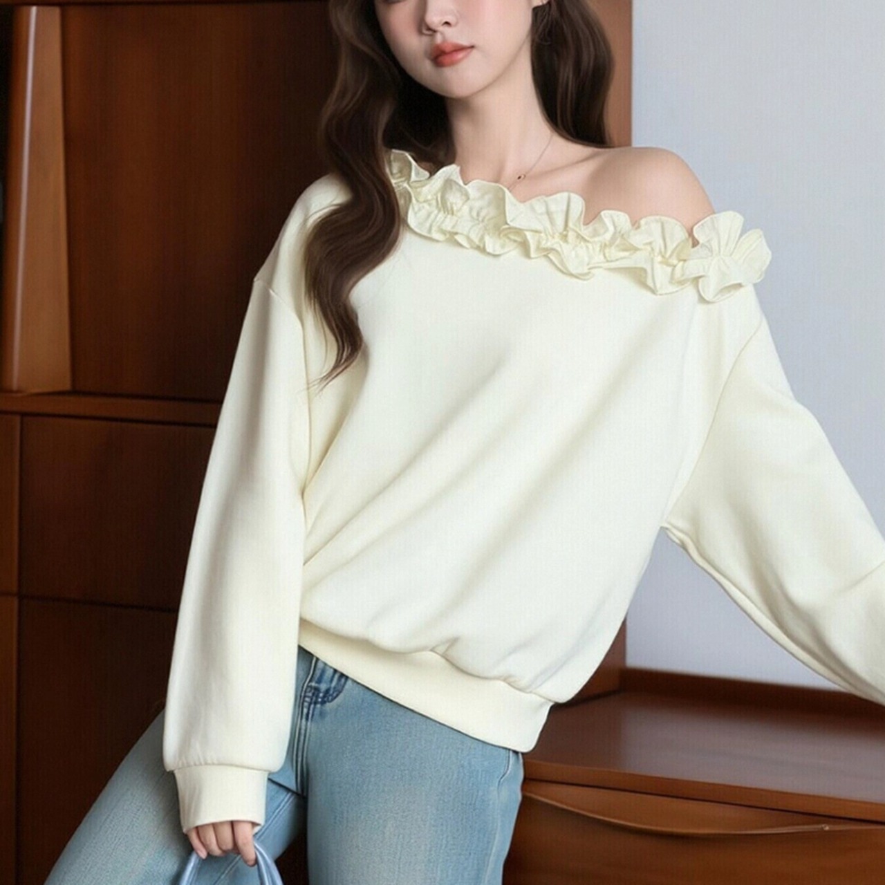 レディース 長袖 トップス 斜め肩 スウェット フリル アプリコット AS12478