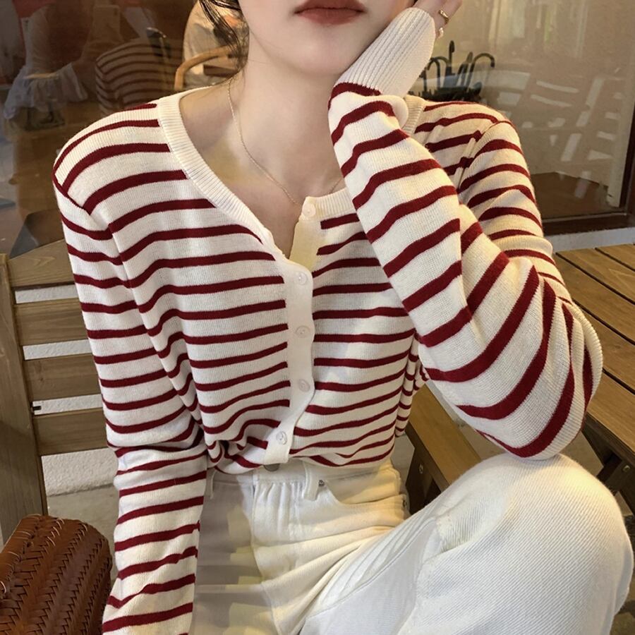 レディース トップス ニット カーディガン ボーダー柄 長袖 レッド 大きいサイズ AS12494