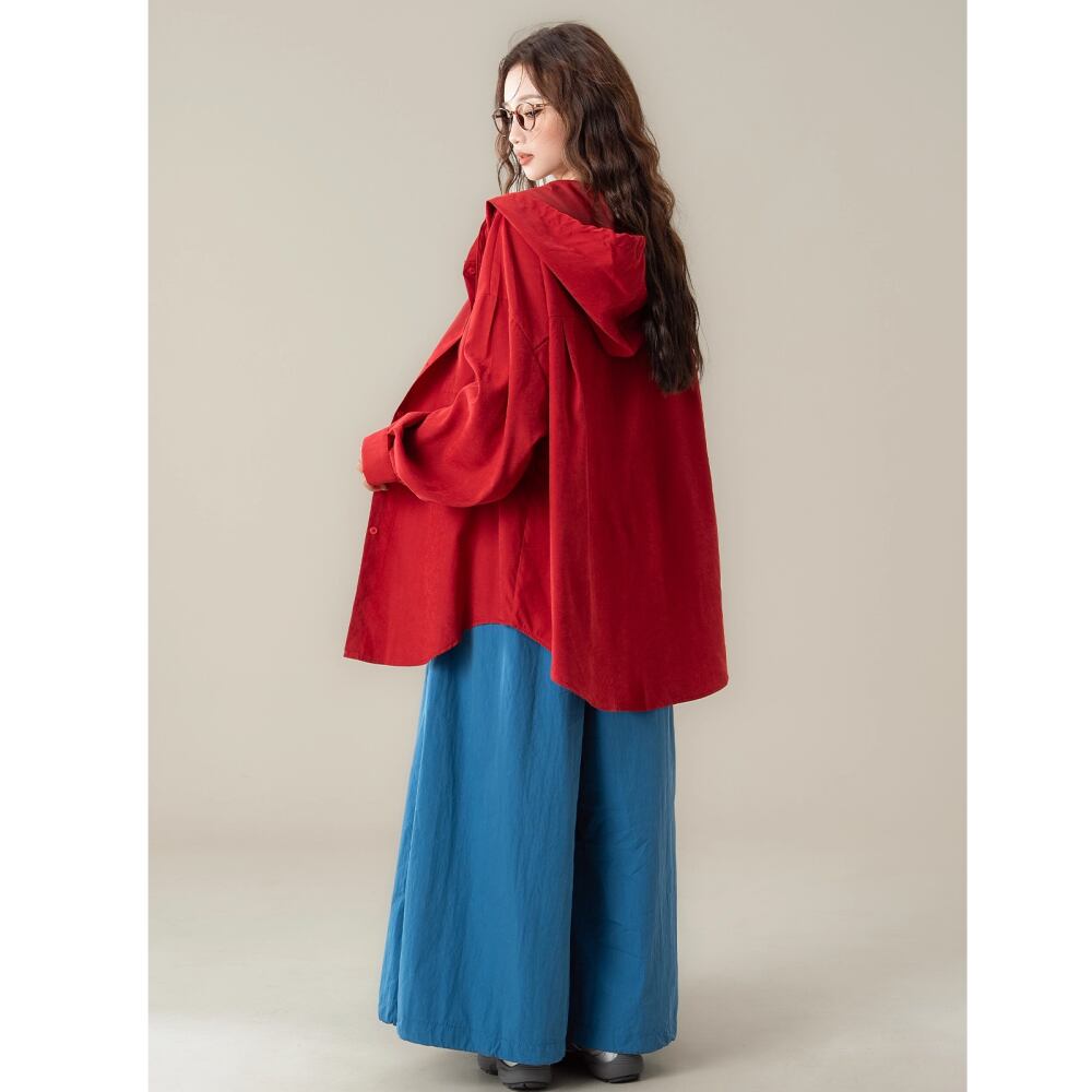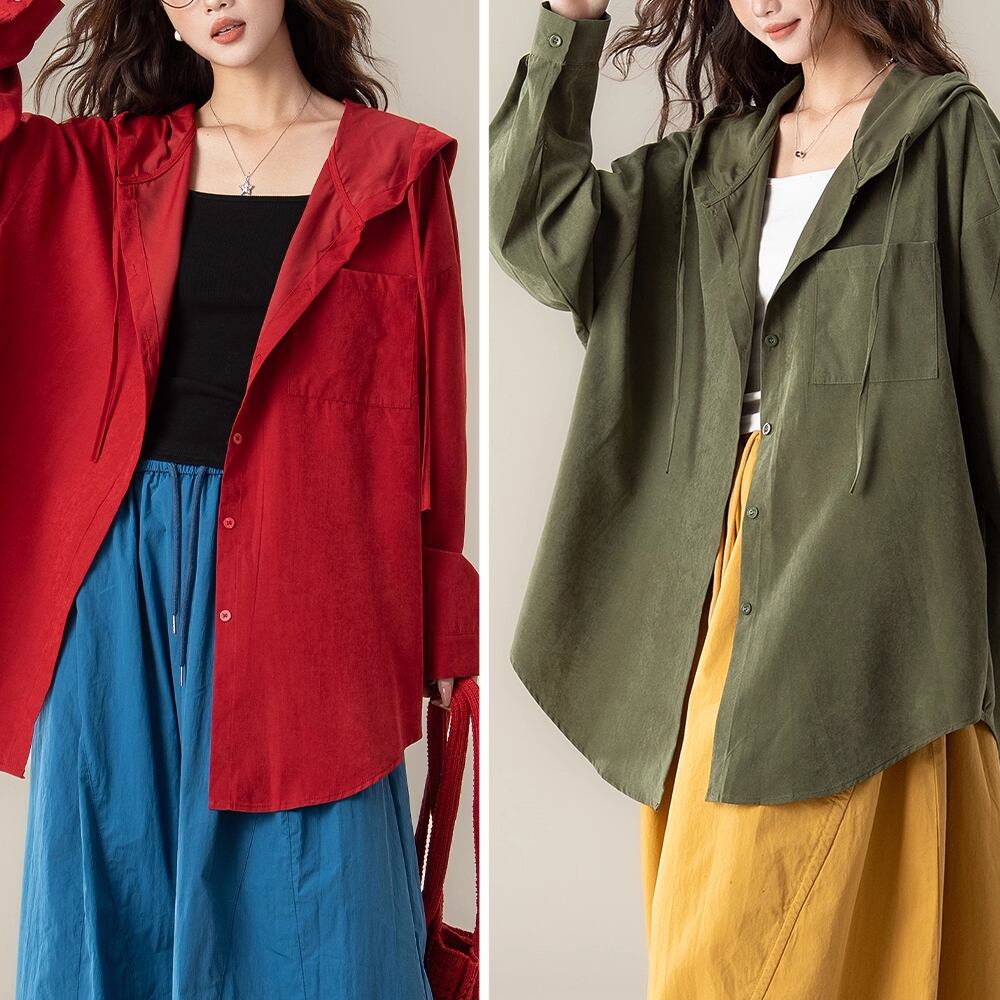 レディース フード付きシャツ トップス 長袖 レッド アーミーグリーン AS12546