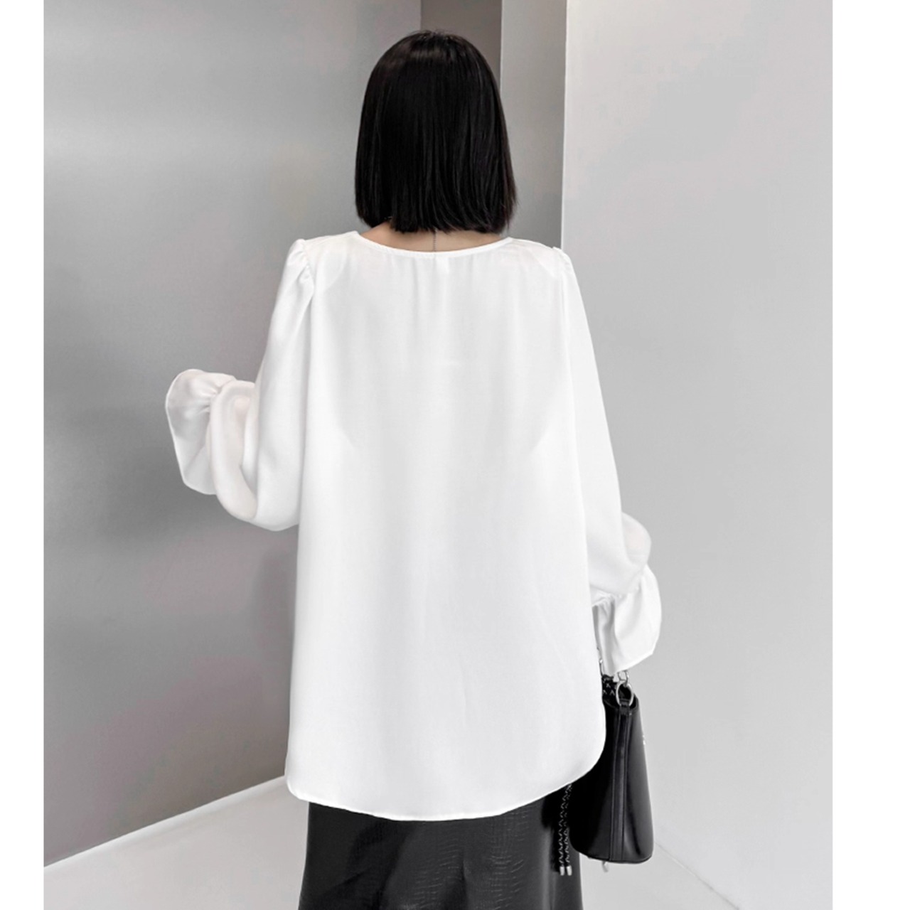 レディース ブラウス トップス 長袖 Vネック キャンディスリーブ ホワイト AS12550