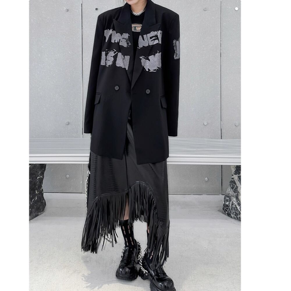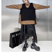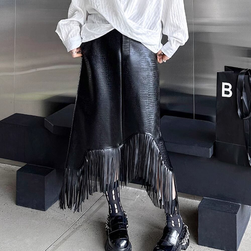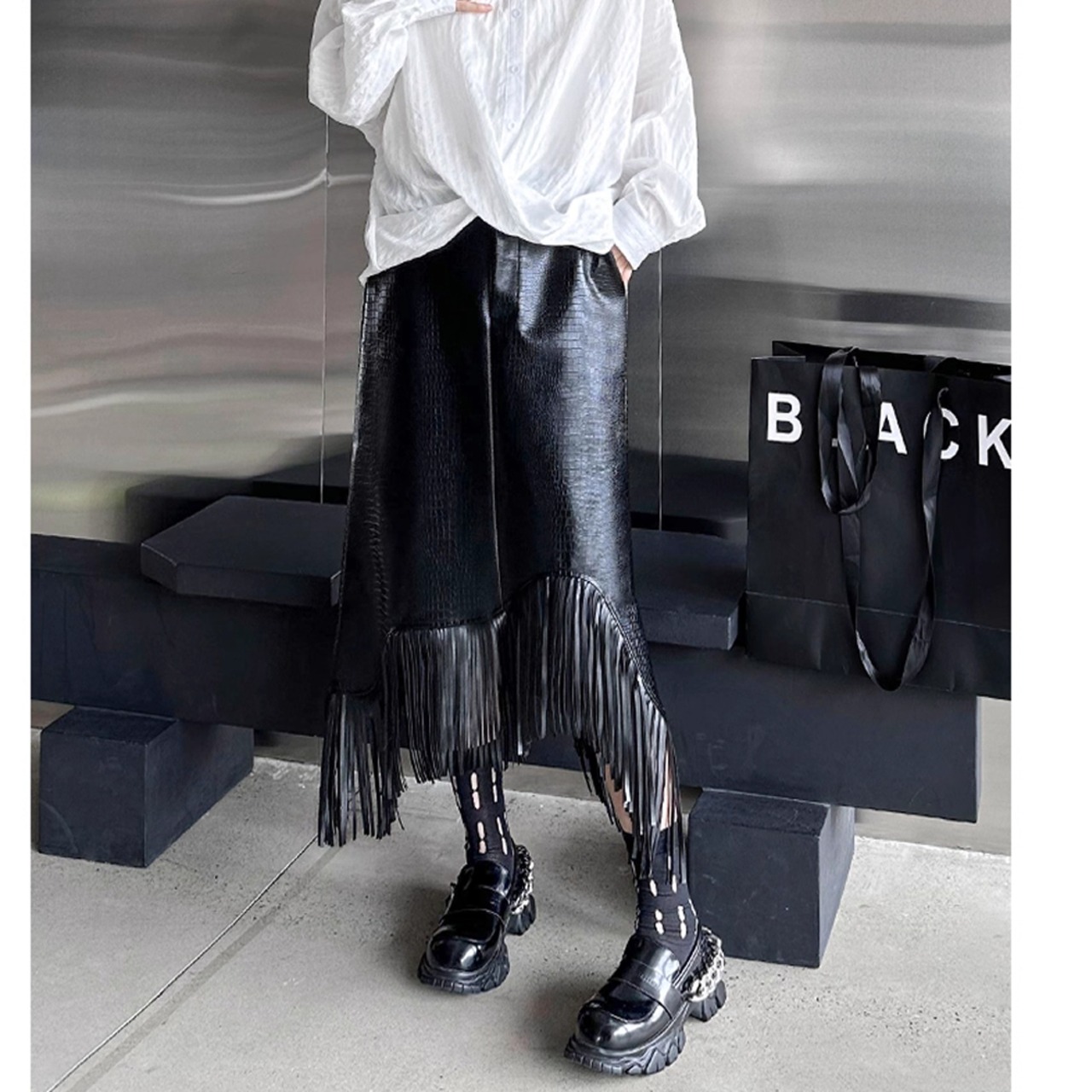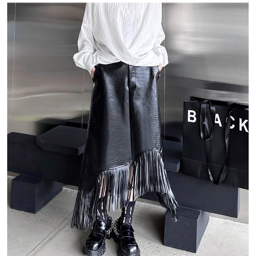 レディース フェイクレザー スリム スカート ひざ丈 タッセル ブラック AS12551