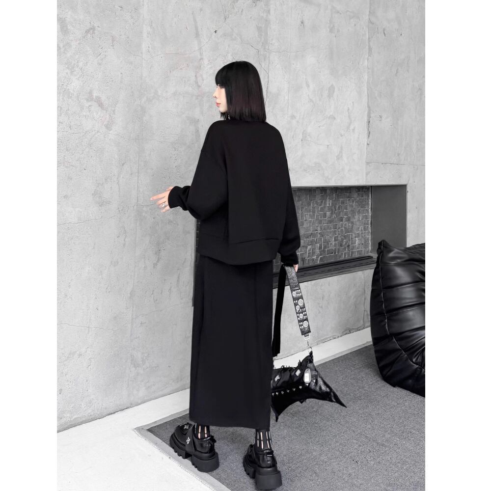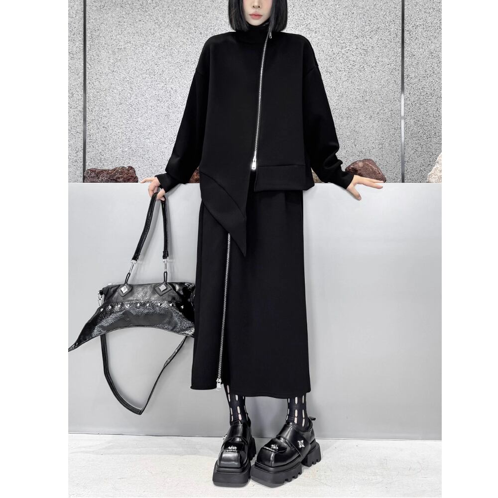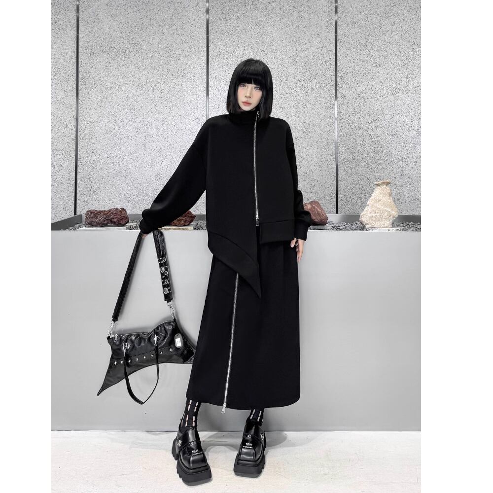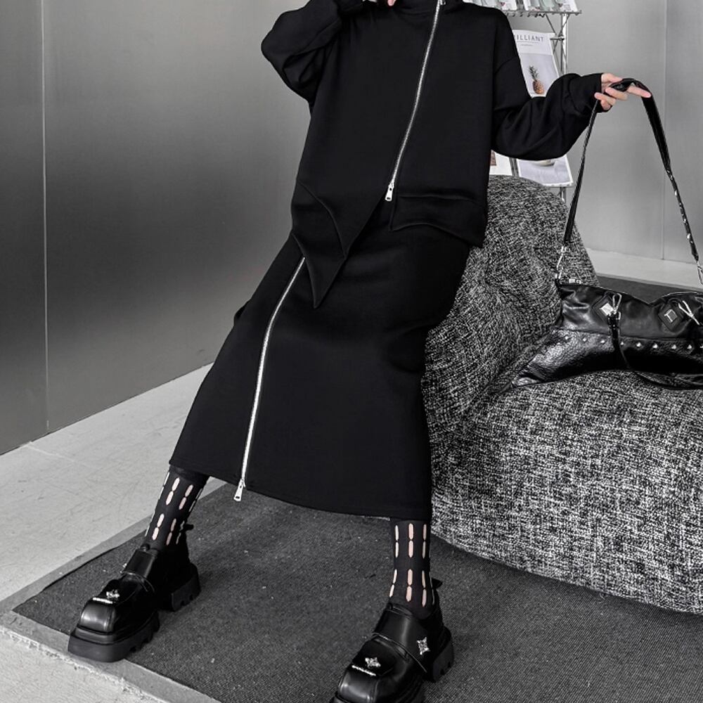 レディース フロントジッパー ロングスカート ブラック AS12554