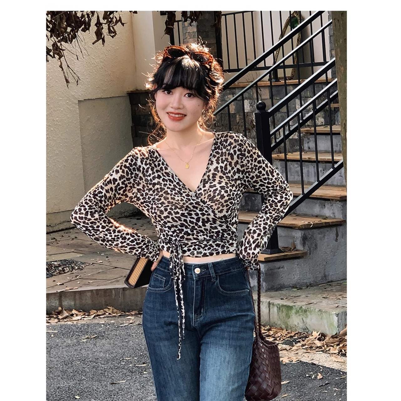 レディース ヒョウ柄 長袖 トップス 薄手 やや透け感 ショート丈 AS12565