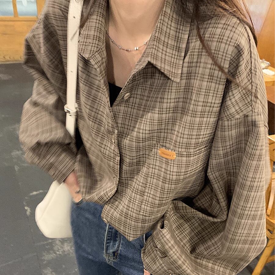 レディース チェック柄 トップス シャツ ブラウン ロング丈 長袖 AS12569