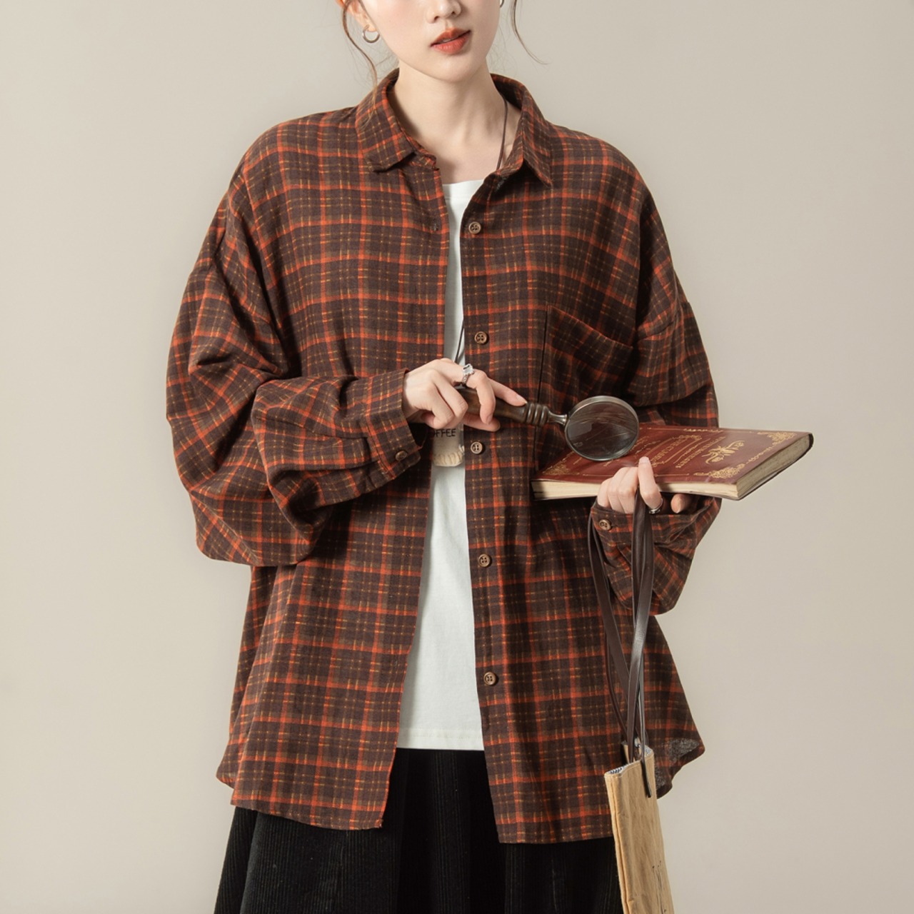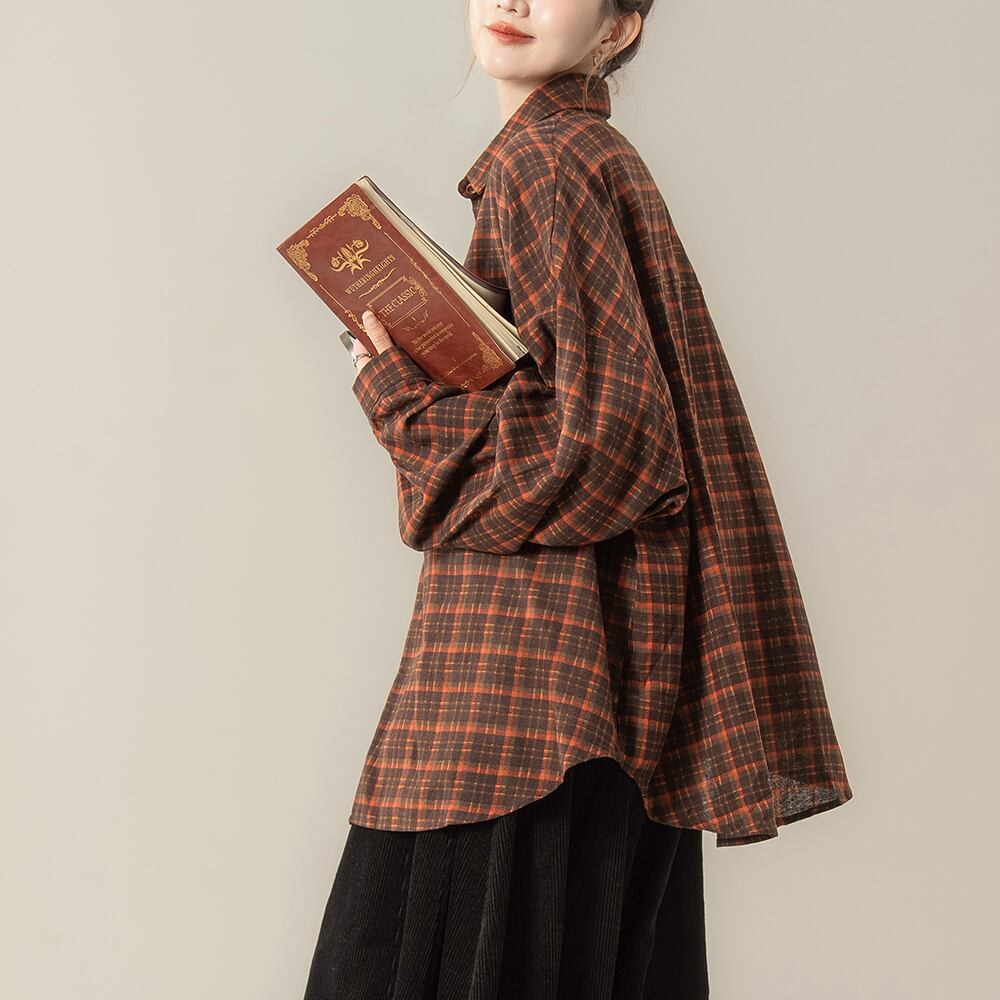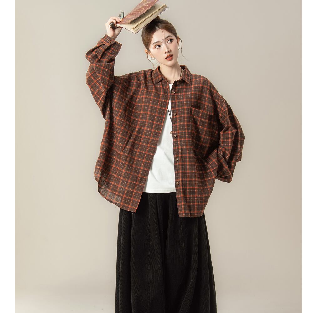 レディース チェック柄 長袖 シャツ トップス ロング丈 オレンジ AS12612