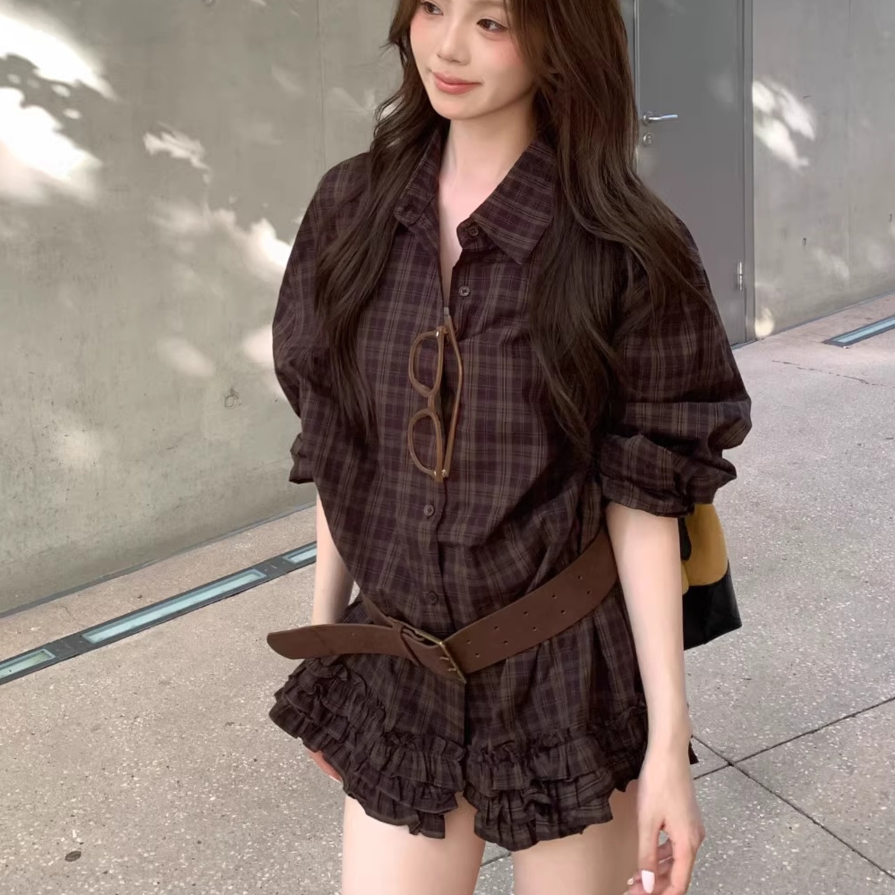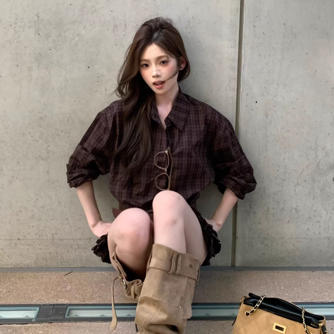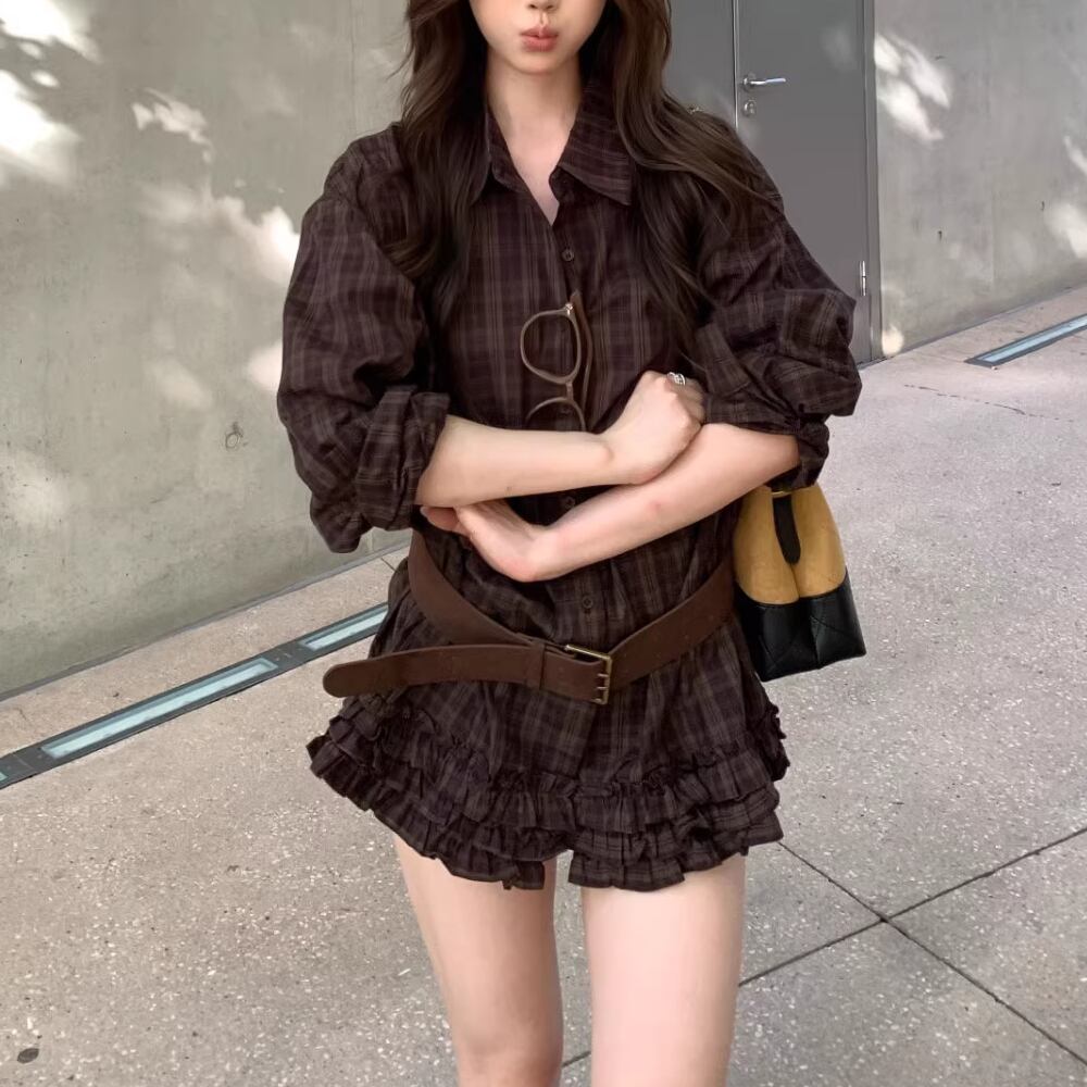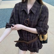 レディース チェック柄 トップス 長袖 シャツ ロング丈 ブラウン 裾フリル AS12623