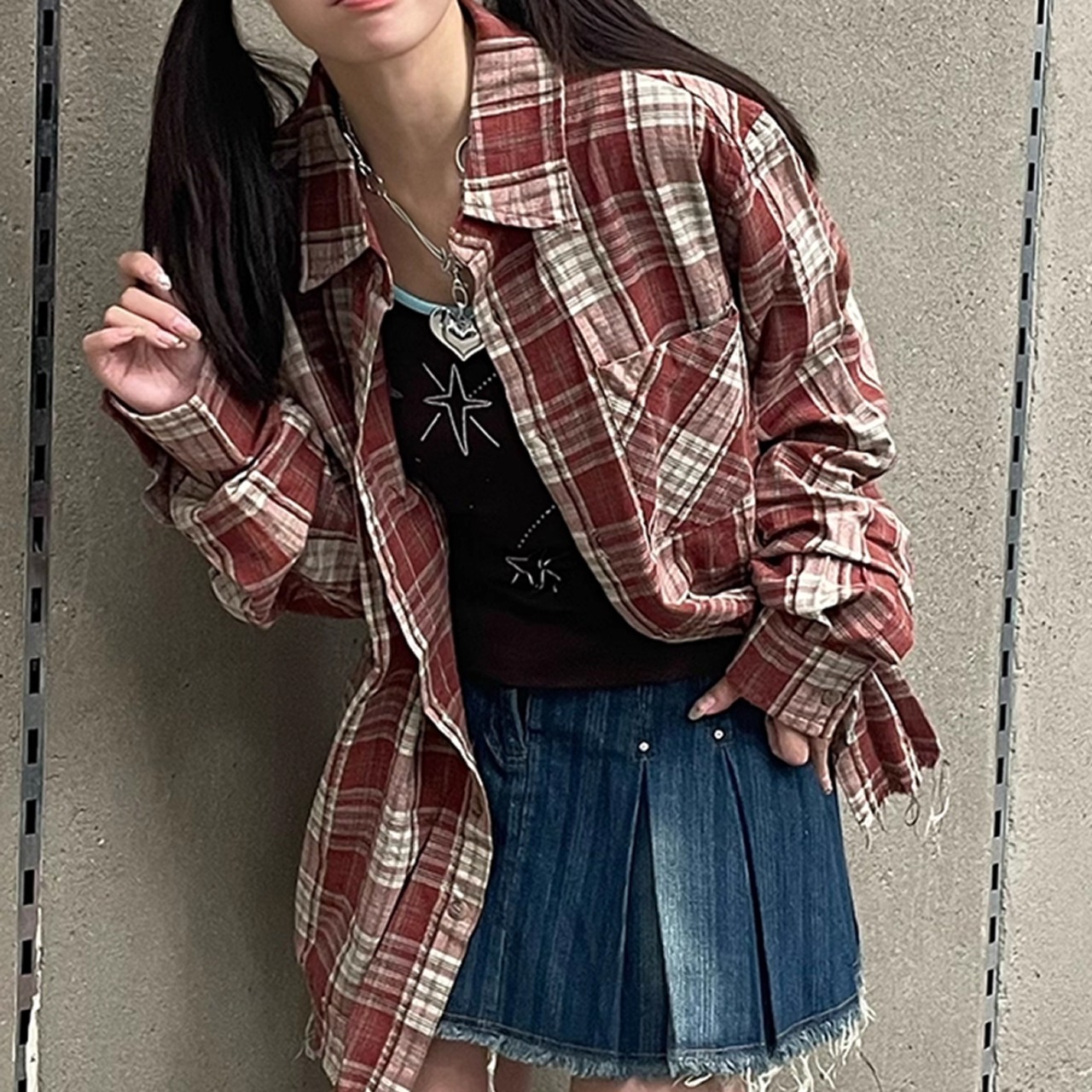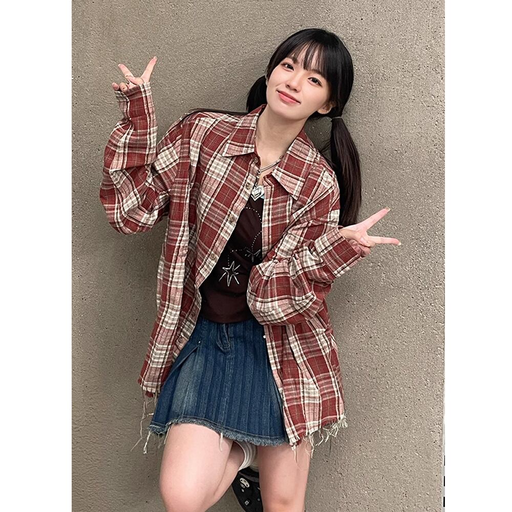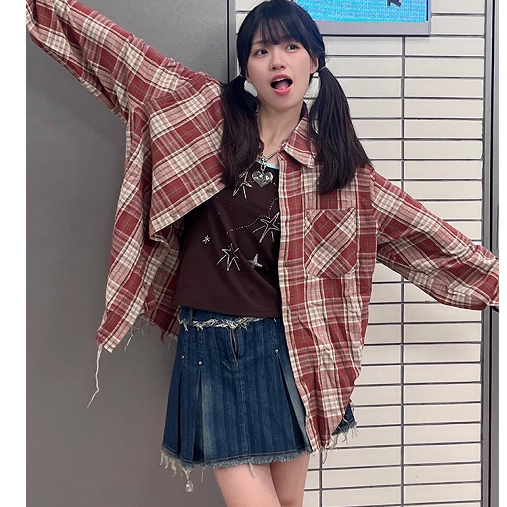レディース チェック柄 長袖 シャツ トップス ロング丈 レッド AS12632