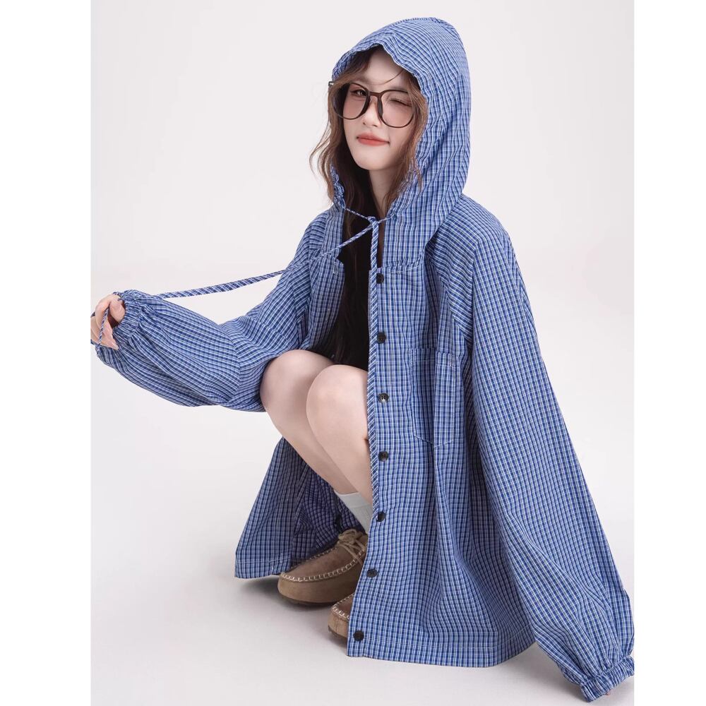 レディース チェック柄 フード付き ジャケット 長袖 アウター ブルー AS12634