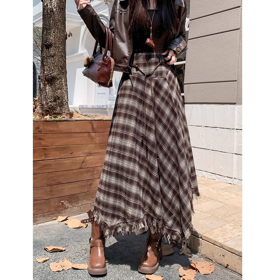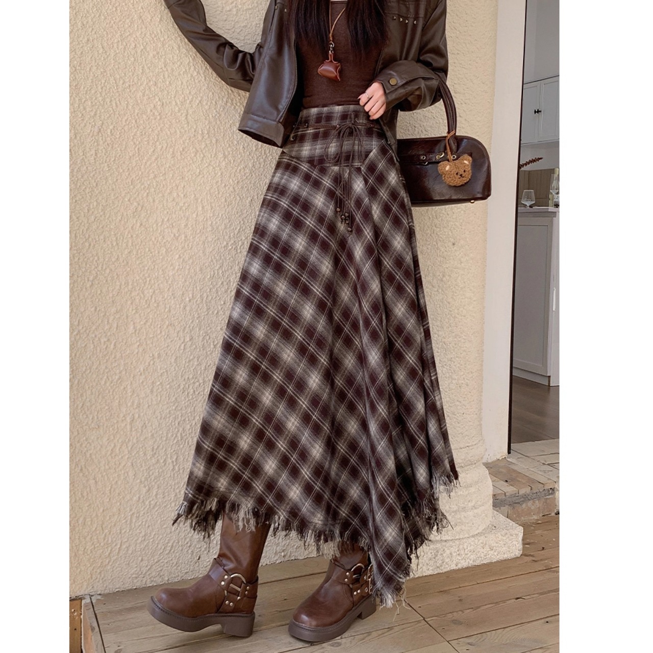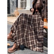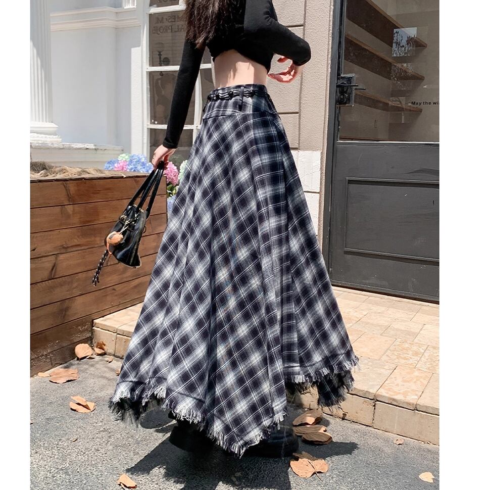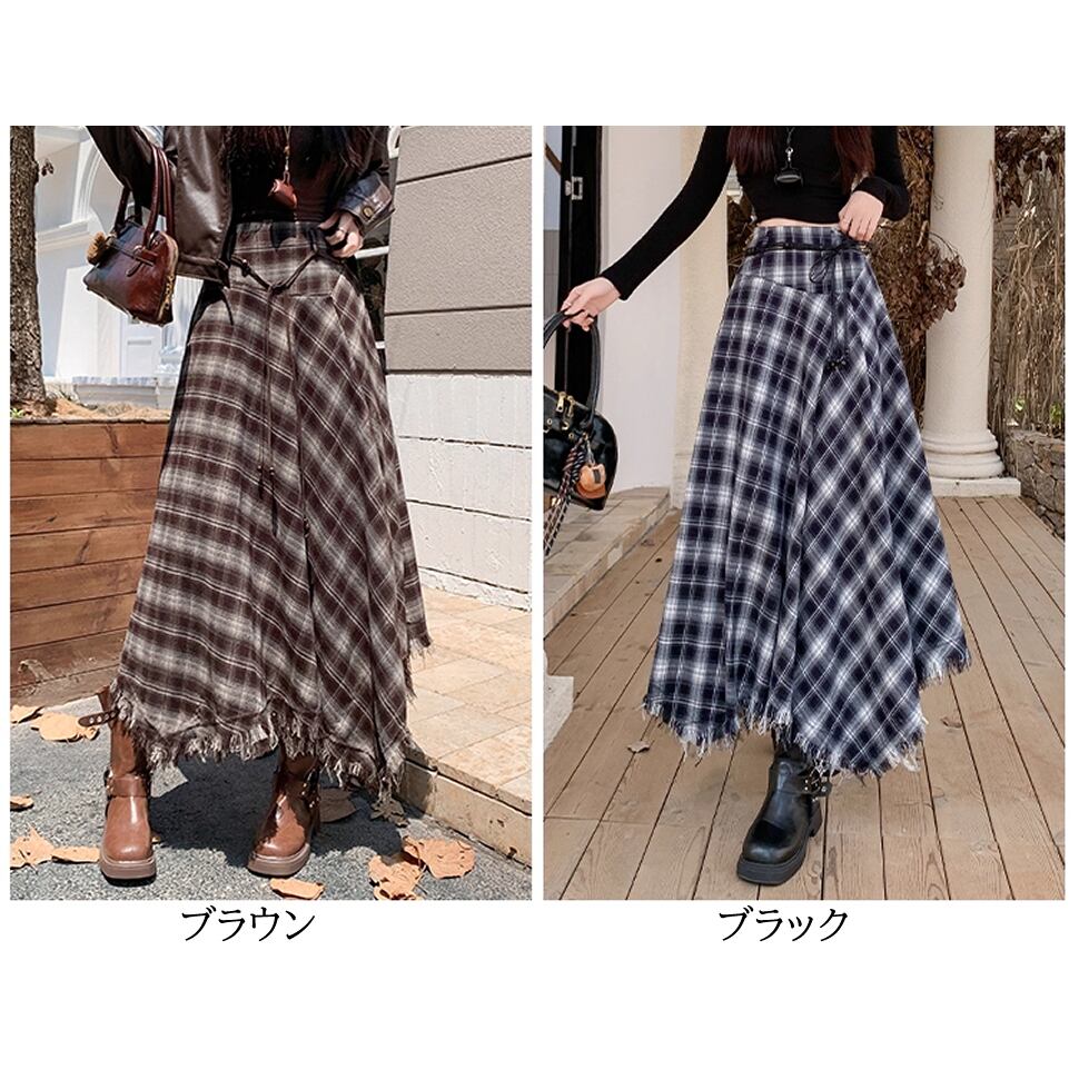 レディース ロング丈 チェック柄 アシンメトリーデザイン 裾フリンジ スカート AS12649