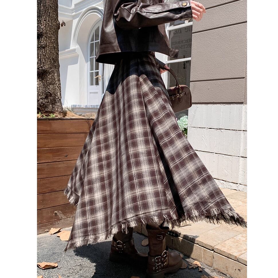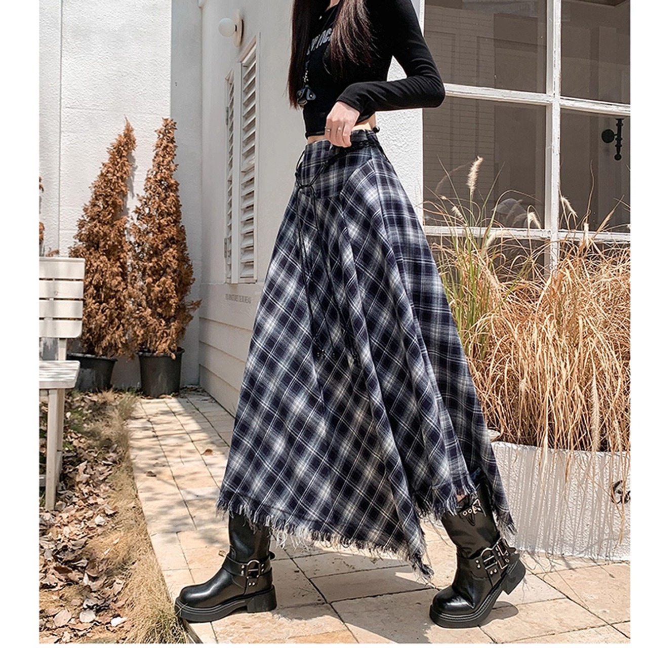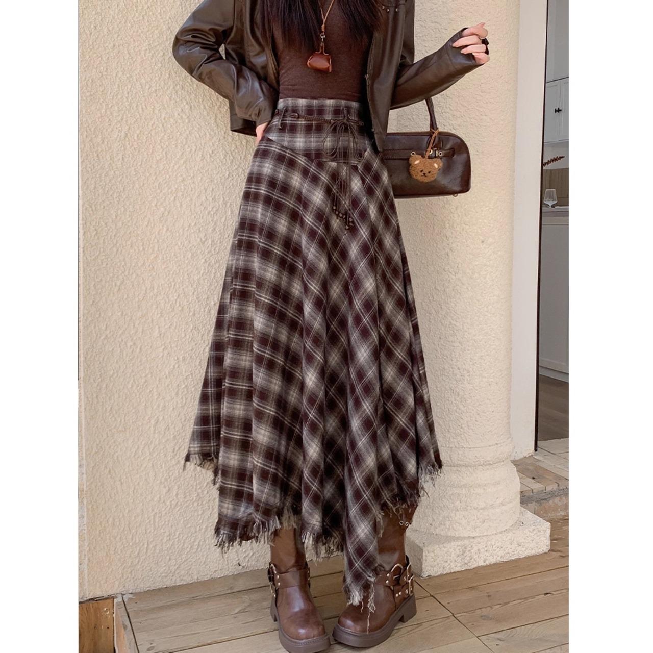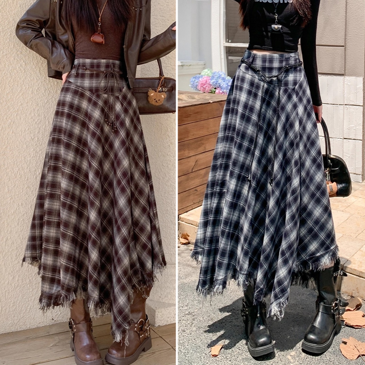 レディース ロング丈 チェック柄 アシンメトリーデザイン 裾フリンジ スカート AS12649